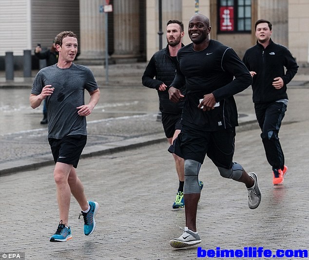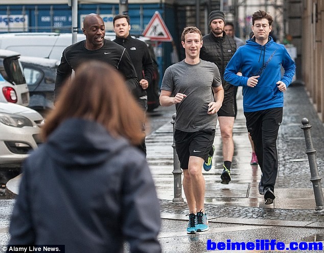 2 e& {$ p( V5 m" h: r8 q1 L 图为一些类似保镖的人陪扎克伯格慢跑。