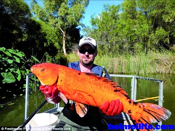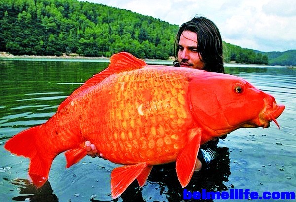 6 ]3 J" G" _% s8 l2 A- F/ @9 Z报道称,总是在水族箱裡游来游去的金鱼,其实可以大到无法想像。近来,加拿大海洋生物专家凯特‧威尔逊 (Kate Wilson)就表示,原本被人饲养在鱼缸裡面的生物,一旦被放生到野外后,就可以无拘束的任意游玩与觅食,所以疯狂进食后的金鱼会大到我们无法想像的境 地。0 k& M$ K" `4 `& B9 k4 I