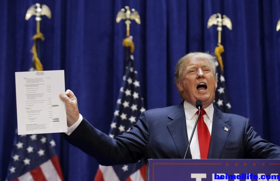 * `. p3 f9 H, I+ s$ P) E美国地产大亨唐纳德·特朗普在宣布角逐2016年美国总统大选的记者会上,宣称自己拥有87亿美元的净资产,强调他真的很有钱。 * k% i- M6 k. G. l
