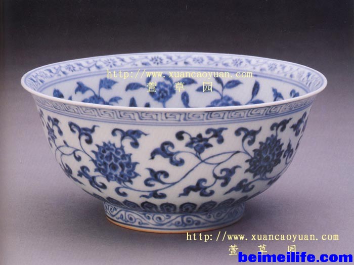 % r3 J9 n- q0 I9 n) s 图9:自然界中的番莲。 3.宣德时期 永宣时期,景德镇的瓷器制作发展在历史上属于一个高潮,尤以宣德最为顶峰,无论是造型还是装饰绘画,宣青都继往开来。在永宣过渡时期,由于制品沿袭使用永乐造型和纹饰,永宣两朝制品差异不大,即人们常说的“永宣不分”,后来宣朝不断发展创新制品造型与装饰绘画,逐渐与永乐时期的制作风格产生差距。缠枝纹应算是两朝装饰绘画的一个缩影,宣德缠枝纹不少是沿用永乐时期的既成纹饰,的确许多器物很难一眼区分制作年代(图10、11)。 图10:宣德青花的转枝莲纹碗。北京故宫藏品。继承使用永乐的缠枝纹饰。