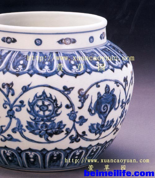 & l5 m1 b# o# d! a$ f八宝纹在元代青花瓷中也常见,或单独、或云托八宝纹等形式,洪武、永乐时期未曾见到宣德时期这种与缠枝莲结合的莲托八宝纹(图15)。该纹饰被崇尚佛教的后代帝王接受,并在御厂制瓷中广泛使用。 图15:宣德青花缠枝莲托八宝纹罐。北京故宫藏品。 4.其它时期 本文暂且撇开空白期,为避免内容空虚,这里简单涉及成化朝的缠枝纹情况。由于成化时期的绘画图案内容极其广泛,涉及到人物、花果、瑞兽等,丰富多彩,于是该朝中以缠枝花纹为主纹饰的制品较永宣时期又少许多,较为常见的缠枝纹有缠枝莲、缠枝莲托八宝纹等。: ^3 O' z3 v1 m, w) s2 l