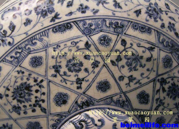 图18:洪武后期的薄釉制品。香港艺术馆展品。可以感觉“青花五彩”的艺术效果。 永宣的釉面虽然也有厚薄不均的不同施釉效果,但是都不及洪武时期的差异明显(图19),应该说,不少永宣青花的浓淡效果还是处理的不错。由于笔者也在以前不少文章中详细提及过永宣青花诸多问题,这里就不再赘言。 图19:永乐时期的青花制品。上海博物馆藏品。也可以感觉“青花五彩”的艺术效果。 五:小结 归结上文,我们可以注意到洪武时期缠枝纹饰图案造型单调统一,永乐时期因伊斯兰文化与汉文化合璧、出现阿拉伯绘画风格的缠枝造型,宣德时期又大胆创新、制作出其它新颖纹饰。以上各朝缠枝纹纹饰的使用变化都从侧面不同程度体现了该朝御厂瓷的大体制作发展情况。