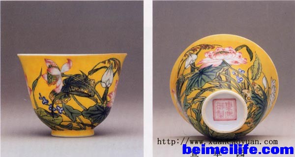 * j/ n5 \4 Q! X; W6 b: A图1:康熙珐琅彩黄地花卉纹酒杯(原书命名“黄地珐琅彩花卉纹酒杯”)。口径6.4cm;1981年5月20日苏富比拍卖 46.2万元港币