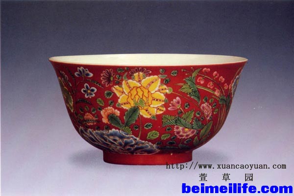 9 d- n0 j0 e" T* h) z图12:雍正珐琅彩红地花卉纹碗(原书命名“胭脂红地粉彩牡丹花卉纹碗”)。口径13cm;2003年10月26日苏富比拍卖 84万元港币
