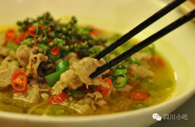 3、然后打去所有料渣不用,再调入精盐、胡椒粉、鱼露、味精和大红浙醋,倒入氽熟的肥牛片,便可连汤带汁倒入装有银芽的玻璃盘中,最后撒入新鲜的小青红尖椒圈即成。
