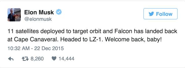 看起来再平常不过的一次火箭发射,但十分钟后,人类航空历史被改写:“猎鹰-9”的第一级火箭顺利回收。 你不懂这里面的重要性?没关系,想象一下有这么几家物流公司,大中,大美,大鹅,他们的共同特点是,每次跑货运长途奔袭到目的地交货,然后货车就报废了……下一次又得开一辆新车出门送货。