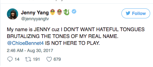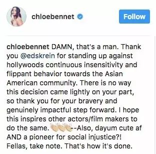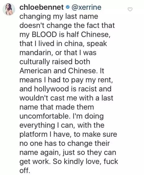 几年前,大家的印象里,明星偶像都还是有着隐形光环和翅膀的,一个个的都是小仙女小公举,不食烟火岁月静好。 而最近,好像全世界的饭圈和娱乐圈,都流行偶像亲自下场怼天怼地,撕来撕去了。比如说你钮钴禄·泰勒和你牛,国内小鲜肉小花们也动不动的整个资源和番位来撕一撕。 不过,明星直接怼好莱坞这样的饭碗行业还是实属少见,况且还怼的引得千人点赞,这种事情果然还是只会发生在美国娱乐圈这片神奇的土地。 所以好莱坞这次又怎么“种族歧视”了呢?还要从一次选角风波说起。 8月28号,英国饶舌歌手和演员艾德·斯克林(Edward Skrein) 在推特上发表长篇公开信, 大意就是,艾德·斯克林受邀出演漫画改编电影《地狱男爵》重启电影中的反派Ben Daimio少校,却随后了解到,该角色有亚裔血统(日裔美国人,)于是他决定辞演这一角色,以避免该角色被“white washed.” 艾德·斯克林曾经出演过《权力的游戏》第三季中的战士达里奥·纳哈里斯,和《死侍》电影中的变种人反派法兰西斯·费里曼。 还凭借在《死侍》中与瑞安·雷诺兹(Ryan Reynolds)的精彩对打,两人共享2016年MTV电影大奖最佳打斗奖。可谓说是继“抖森”(Tom Hiddleston)之后凭借饰演反派在好莱坞打开市场的一枚新星。 他在公开信中提到,“种族多元化(在影视文化中)的表现非常重要,尤其是对我这样一个来自混血家庭的人来说。我认为这是我们的责任在困难的时间做出符合道德的决定让包容性发声。我希望有一天,这样的讨论可以不必要再发生,我们可以为艺术表现的平等性共同努力。” 你可以说他有个人名声的考虑,但是这种勇敢放弃利益去为了他人争取平等权益的行为获得了网友的一致称赞,同时也有不少他的明星好友竞相转发,回复挺他。 其中最引起网友热议的回复就是我们今天的主人公小姐姐,Chloe Bennet(汪可盈)了。 中美混血的汪可盈92年出生于美国伊利诺伊州芝加哥。父亲Bennet为华人,是一名投资银行的理财顾问。母亲Stephanie为美国白人,工作为内科医生。 她15岁时搬到中国大陆和祖母同住,在上海及北京学习中文,2011还推出单曲唱片Uh Oh,在中国小有名气后,又决定回到美国发展。这几年,她一直在漫威剧集《神盾局特工》中扮演特工Skye,黛西·约翰森,获得了一群粉丝的青睐。 她28日在艾德·斯克林的公开信下面留言,大赞对方的仗义执言。 “真够男人!@艾德·斯克林谢谢你站出来反抗好莱坞这种对于亚裔美国人群体持续已久的麻木和轻率。你做这个决定一定很难,所以更感谢你的勇气和明智的影响力巨大的一步。我希望这能启发更多的演员和电影制作人!----还有,太塔马可爱了,你是反对社会不公正的先锋。朋友们,记住了,以后就这么做!” 如此直率大胆的发言让许多网友直呼:“她诚实的可爱!”当然也有网友质问她“你自己都把你原来的姓(Wang)改成看不出种族的(Bennet)了,你有什么资格要求亚裔权益?” (汪可盈与家人) 这就牵扯到了一段往事。 数年前初闯娱乐界时,汪可盈一直用本名Chloe Wang寻找机会。 然而她发展的并不顺利,身为“有色人种”,好莱坞星探对汪可盈不是很热情,所以她只能演一些小角色甚至没有工作机会。 她在成名后接受杂志采访时表示,她的中国姓氏使她在争取角色时很难被选中,被生活所迫的她决定改个名字试一试。但她就算起个艺名仍然希望能够尊重父亲,因此她改用爸爸的名字Bennet作为姓氏。 在那条回答质疑的回复中,她也再次讲述了这个故事。 “就算我改了姓,也不会改变我有一半中国血统,我在中国生活过,我说普通话和我在中美两种文化中成长的事实。(我改掉姓氏)只是因为我得付房租,但是好莱坞是那样一个种族歧视的地方,他们不愿意选一个姓氏让他们感到不舒服的人。而我现在用尽全力,能做的都做了,能利用的资源都利用了,就是为了确定没人再需要为了得到一份工作而改掉名字。所以黑粉给你们一个爱的抱抱,快滚吧。” 而对于有网友说她没有被试镜成功是她演技不好,也马上有网友怼回去说,改了姓氏不到一周,汪可盈就争取到了在好莱坞的第一个重要的角色。她说,“这就是好莱坞运作的把戏。” 在她之前的采访中,也有粉丝以为汪可盈改姓,是因为她不想被别人看出是华人。然而恰恰相反,她一直以自己华裔的身份自豪。她说:“我只希望大家认识我,让我的性格表明我是怎样的人,而不是由族裔背景界定我这个人。” 对于汪可盈的这番发自肺腑的直接怼好莱坞,也让许多亚裔和少数族裔美国演员和明星纷纷跟帖。 (美国非裔演员维特·妮可·布朗) (美国韩裔喜剧明星,郑肯,代表作“Fresh off Boat”) (美国华裔喜剧作家,Jenny Yang) 还有不少网友分享了自己在工作中曾经遭受种族歧视的经历。 (就算不是演员,在日常生活中也会遇到这样的事好吧。有时候他们因为黑肤色可以多赚钱就雇我,有时候因为我的肤色拒绝我……) (有色人种有时候需要牺牲他们的一部分赖在这个社会生存,天然的发色,口音,文化,对自己根源的记忆。我有时候只因为在面试表里选了“我是黑人”就被拒绝面试,而我开始选“我是白人”选项就有了面试机会,同一份简历,同一个名字……) 也许汪可盈只是对好莱坞长期种族歧视勇于反抗的一个代表,但是被誉为“白左”大本营的好莱坞这些年一直没少作妖。 尽管明星一直以自己政治正确为傲,但对于电影制作人和投资商