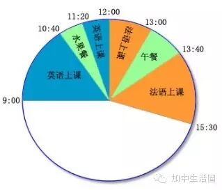 圈友 早晨7点半起床,洗漱吃饭,去坐校车。9点开始上课。10:40第一个nutrition break:先唱国歌,然后到操场活动20分钟,接下来20分钟吃带的水果点心之类的。11:20-12:00接着上课。12点换教室,切换英法语。13:00午餐时间,还是20分钟操场疯跑,然后20分钟午餐。接下来上课到下午三点半,放学。