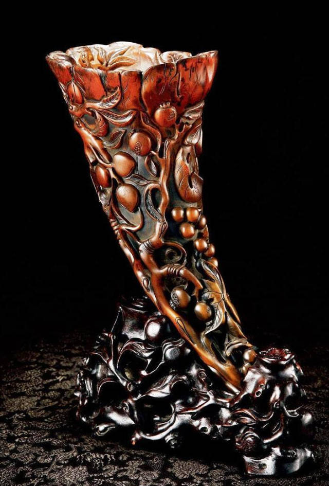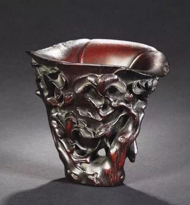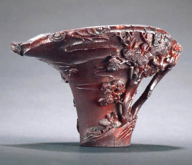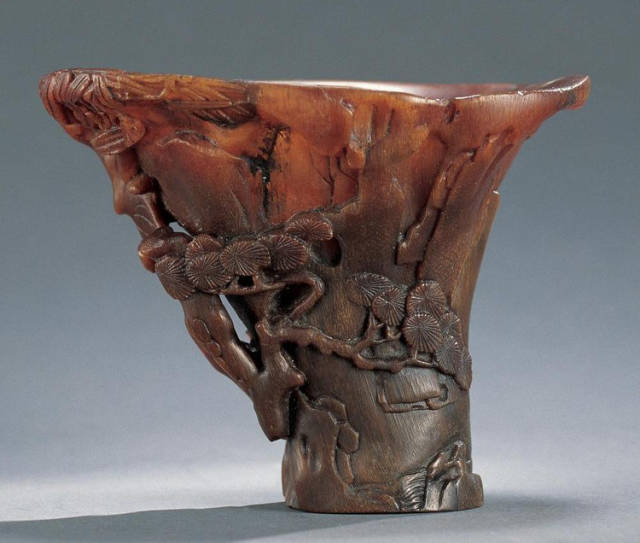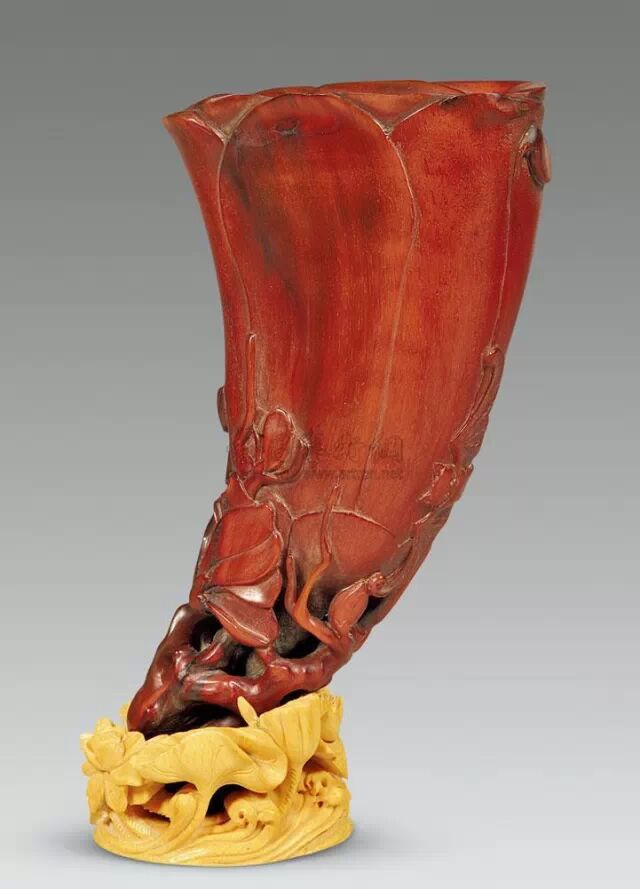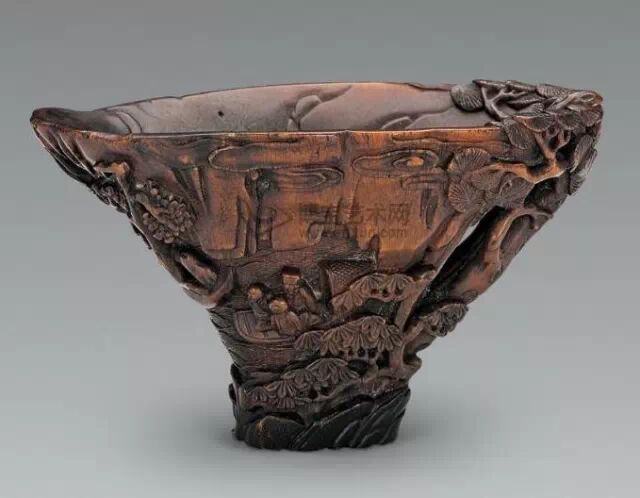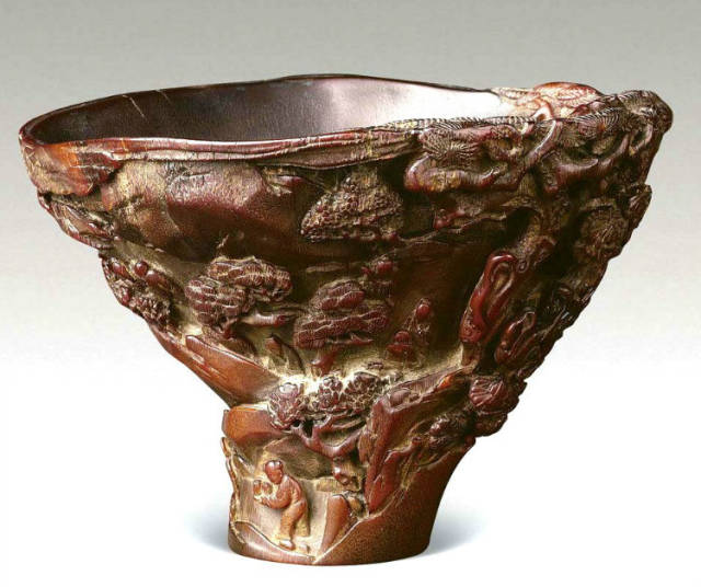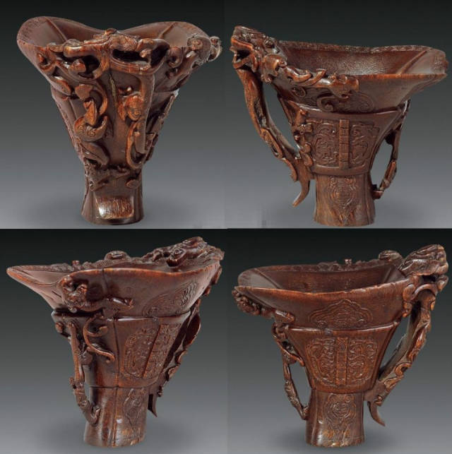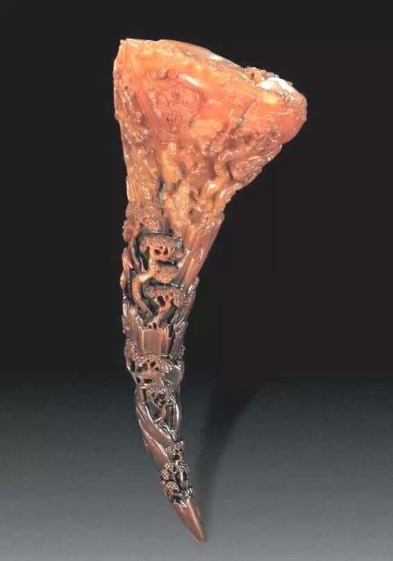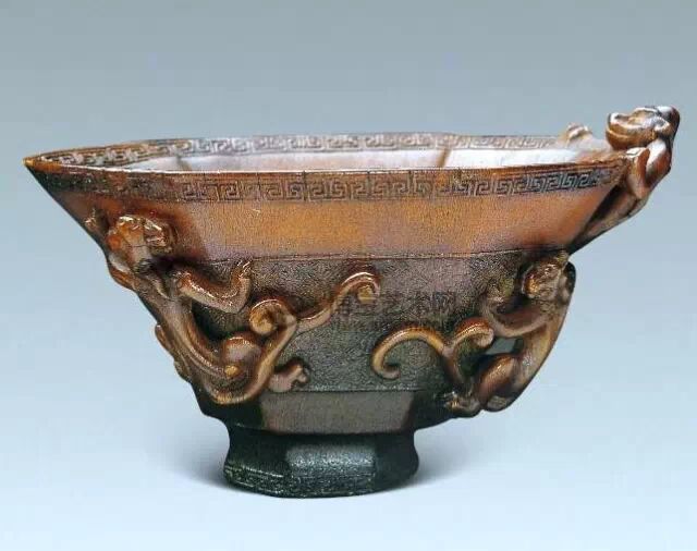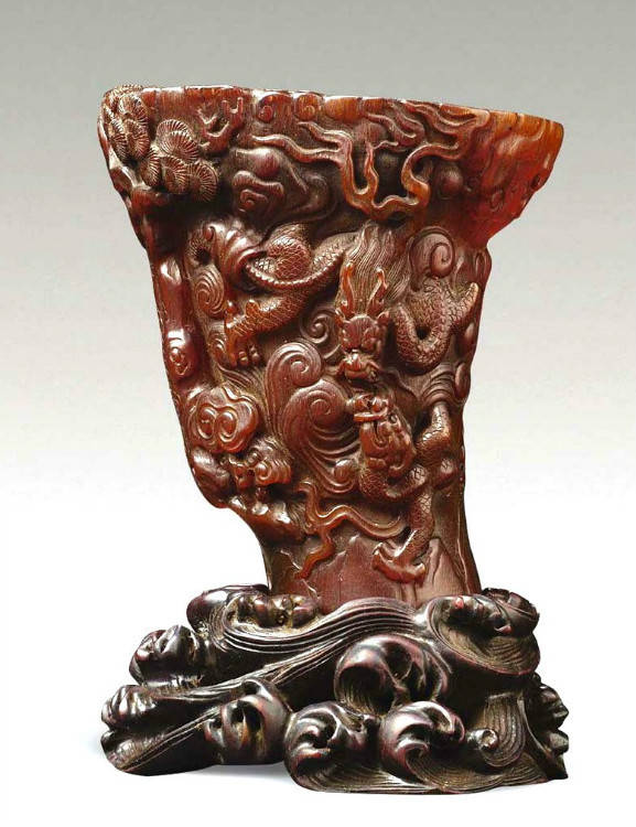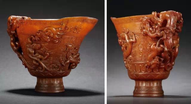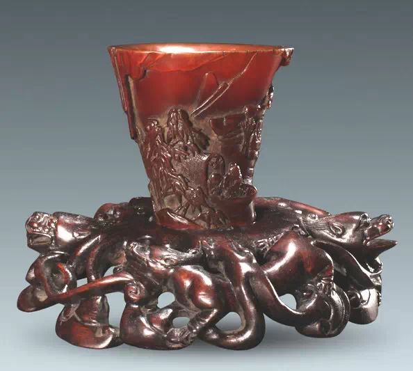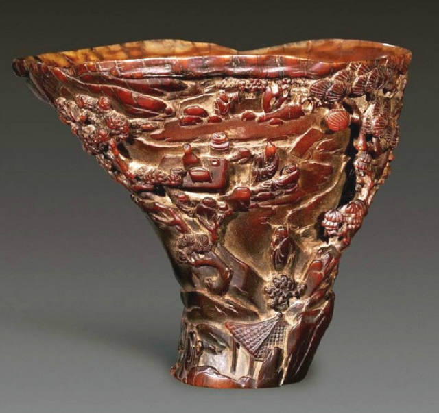 清初的犀角雕刻继承明代的传统风格。因明末着名的牙角雕刻家仍继续从事雕刻工艺。雕刻蟠螭纹和龙纹的犀角杯数量增多。进入乾隆朝,犀角雕的器形种类颇丰,除杯外,有圆雕人物、洗、挂件及仿古器形爵、鼎、羽觞等,雕刻工艺精致至极。清后期,犀角料进口减少,且主要作药材,犀角雕刻艺术遂走向衰落。 (清 犀角花瓣纹碗连象牙底座) 001-清 犀角雕螭龙饕餮纹酒杯 长16.1cm;宽8.9cm;高9.1cm 用十八世纪东南亚犀牛角雕琢而成。色泽浅灰黄色,角尖较深,呈灰褐色。杯呈九瓣花形。口部近椭圆形,流部较宽,窄部透雕螭龙纹把。椭圆形小圈足也呈九瓣花形。虽以花瓣为形,纹饰上却仿古,仿商用青铜器上纹饰。口沿内外和足墙阴刻回纹,身部以阴刻回纹为地雕饰平凸的饕餮纹,并高浮雕两条威猛的螭龙,胫部浅浮雕叶脉纹。清廷匠师将花形和仿古两种主要的犀角杯造型巧妙地融合在一起。犀角具清热消毒,止血滋补之良效,清代宫廷多将其制成酒杯以强身祛病。 002-清中期 雕螭龙犀角杯 003-清 犀角雕龙纹杯 高12cm-RMB 3450000 整器以犀角雕刻而成,呈褐色。敞口斜腹,腹部利用角料自身的凹凸,外壁及口沿浮雕琢出螭龙做成把手,浮雕图案延伸到杯口沿的内侧。雕刻精细,浮雕与刻琢结合,突出了纹饰层次。杯下腹部两侧以祥云、草木等饰之,并雕刻出三层纹饰。整个犀角杯大气沉稳,透出盈盈古意。 004-清•犀角杯 高:8cm重:178克-RMB 246400 以整块犀角制成,角制细润,颜色褐红,包浆厚重润泽。角杯内外口沿处为一圈回纹。杯身中部亦以回纹为地,其上浮雕青铜器之夔龙纹。角杯一边为一高浮雕变形螭龙。爬于角杯口沿,螭龙面部以简洁的设计与刀工琢刻出觊觎酒杯的螭龙面孔。腿足刻饰为云纹,使角杯显得更加生动活泼。 005-清 犀角螭龙纹杯 长18cm;重865克,有裂-RMB 782000 006-清 犀角螭龙杯 宽14.5cm,470g-RMB 690000 杯敞口,造型仿自青铜酒器,整器以整支犀角雕成,取料硕大,色范红褐,包浆温润。内沿处刻回纹,杯身以饰以三层纹饰,自上而下为回纹,浅浮雕兽面纹为地的圆雕夔龙纹和蕉叶纹,只见夔龙攀附于杯身之上,龙头探入杯内,身形灵动,另有几条小龙攀附其间,层次分明,起伏有度,形象生动;与之对应的另一边口沿亦高浮雕小螭龙三条,翻转自如,雕工细腻,栩栩如生。全器包浆温润,阴刻、透雕、浮雕等技法并用,线条流畅,作品静中显动。 007-清 犀角仿古铜杯 高7.5cm-160,000-240,000 008-清 犀角雕螭虎杯 长13cm;高10cm-RMB 300,000-400,000 009-清 雕龙纹犀角杯 6×8cm-RMB 126500 010-清 犀角雕饕餮螭龙杯 高15.8cm,437g,象牙座-RMB 300,000-300,000 011-清 犀角雕夔龙螭虎杯 长13.8cm,重约470克-RMB 287500 犀角自古在我国就已十分珍贵,而犀角雕刻品更是被誉为奇珍异宝,被皇室贵胄和达官贵人用以炫耀财富。其多随形雕作酒杯,不仅造型精美,且因犀角本为名贵药材,故而更显其优。此件犀角杯材质凝透,包浆润泽,轮廓线圆滑柔和,纹饰古雅适度,颇具古韵,为清代十分难得的精品。且杯身螭龙刻画得气势恢宏,苍劲有力,精巧华美,极富艺术表现力,颇具收藏价值。 012-清 犀角雕兽面纹杯 013-清 犀角螭龙小杯 014-清•犀角雕长安乐宜子孙款爵杯 高:14.1cm 重:188g-RMB 575000 015- 清 犀角雕山水人物纹爵形杯 直径16.2cm×高15.3cm,重1100克,带紫檀海水纹座;RMB 392000 犀角雕,通体主要采用浮雕,镂雕技艺,将苍松雕成柄,且上连杯口下至底足,枝头攀附过强入于杯口内壁,古趣横生,春意盎然。外壁浮雕饮马图,仿自赵孟俯之饮马图。此杯将圆雕、浮雕、镂雕等技法融为一体,莹然欲透,刻工高超,刀法精绝,纹饰细密精美,既有仿古格调,又有创新的意境,为犀角雕刻的精品。 角雕是用兽角雕刻和磨制而成的工艺品。清代,由于工艺美术突飞猛进的发展,雕刻工艺达到了一个新的高峰,精湛的雕刻艺术扩展到犀角材质中来,这样,形状众多,花纹各异的犀角杯就脱颖而出,闻名于世。 所配之底座,乃小叶紫檀材质,质地细腻,通体镂雕海浪纹,以护固杯身,别致精巧,古朴典雅。此犀角杯工艺精湛无比,所雕诸景生动逼真,富具立体感,为清代雕刻不可多得的绝妙佳品,弥足珍贵。 016-清 犀角山水人物杯 重100.9g 犀角杯的雕刻,首先要根据它原材料的形状条件,此杯选用上等犀角为材料,缜密构图。采用高浮雕技法,雕刻一幅山水人物图,老者携童子泛舟于湖水之上,对岸一老者坐于树下,周围竹林茂盛、苍松挺立。将一幅优美闲逸的山水人物画跃然于此杯之上。细部刻画极为精细,人物表情生动,充分体现了其高超的技法,整件犀角杯风格古朴雅致,是件难得的清代犀角精品。 017-清 犀角雕高士雅集纹杯 高9cm;重190克-RMB 649600 杯为犀牛角制成,色如深色琥珀,有着一层柔美的琥珀光泽,富有灵气。此杯采用浅浮雕、深浮雕、镂雕和圆雕的等多种雕刻工艺手法,层次分明,错落有致,作工精细,显示了作者精湛的工艺水平,当为犀角中的精品。其画面置于深山老林间,作者以通寻的方式,将杯镂雕成二三层,苍松耸立,松枝直入杯口之入,曲折婉转,杯璧上,小路蜿蜒,直入杯底,松柏、桐树、枫树、间插在山岩之间,虬枝怒干、雄健苍劲、老林古松,参天敞日,极具幽静之意,山间崇山峻岭间隐约露出亭台楼阁,似通往人间仙境,杯底深圆,角质细润密实,在不惜浪费珍贵的犀角材料,运刀流畅,刀锋犀利,画面生动,令人叫绝,是犀角雕刻中极高趣味的作品。 018-清 犀角雕山水人物杯 宽12.7cm-R
