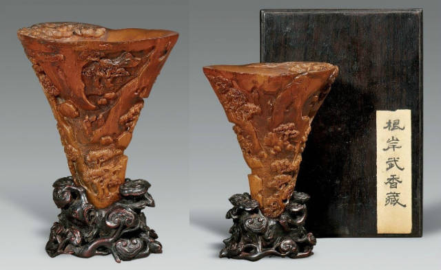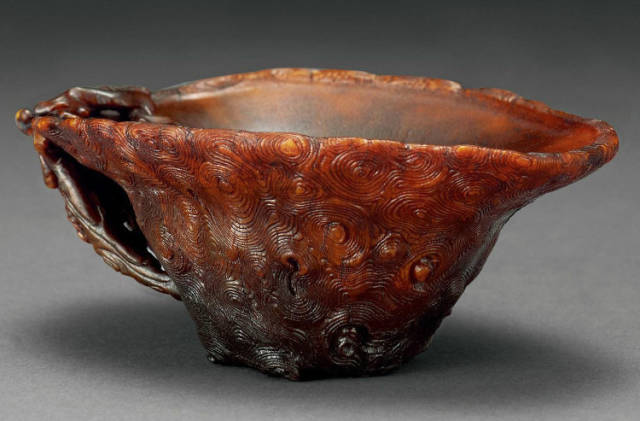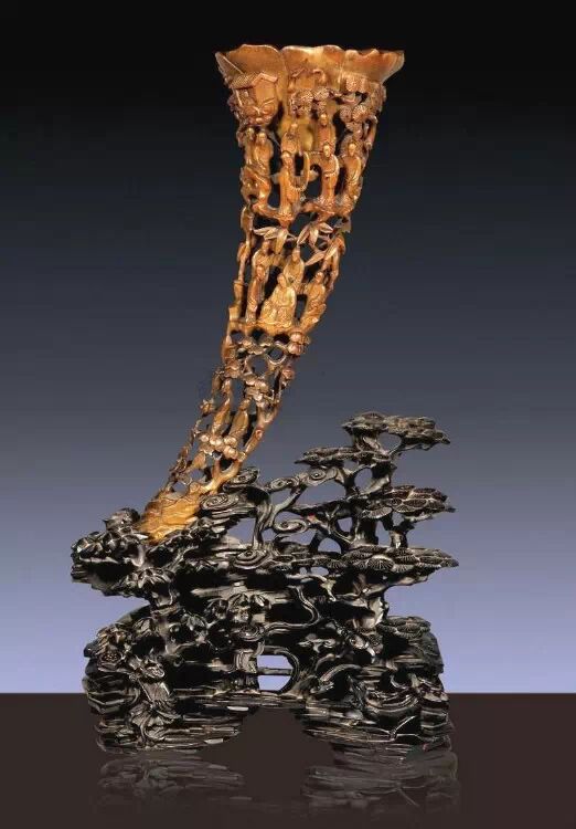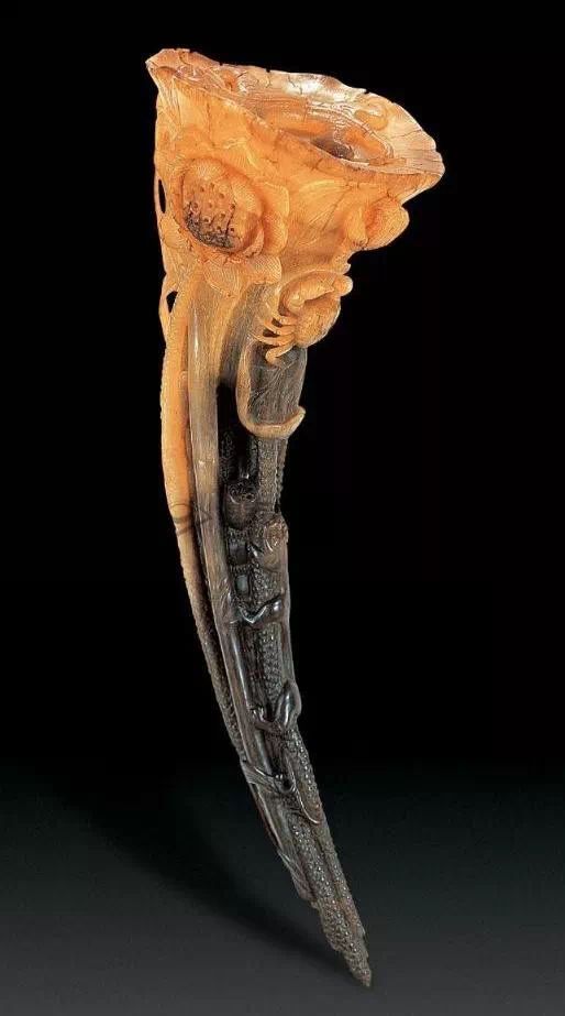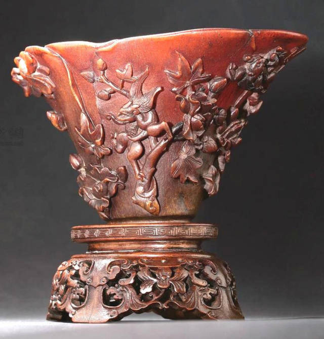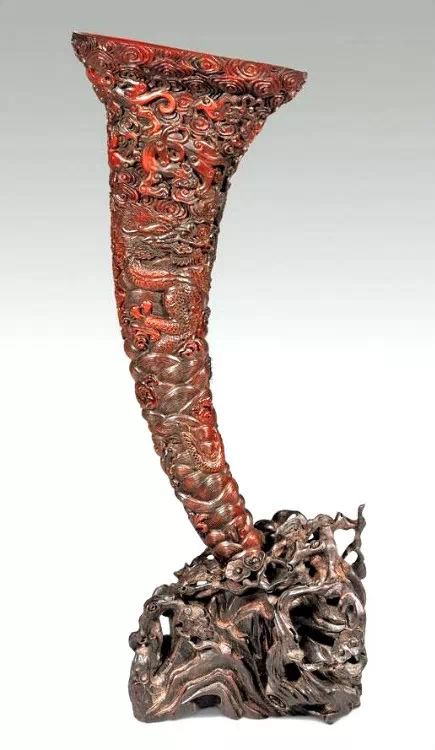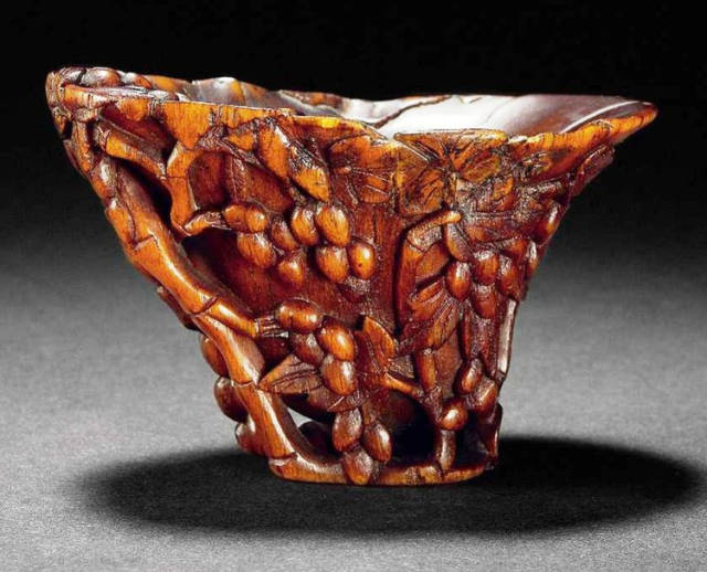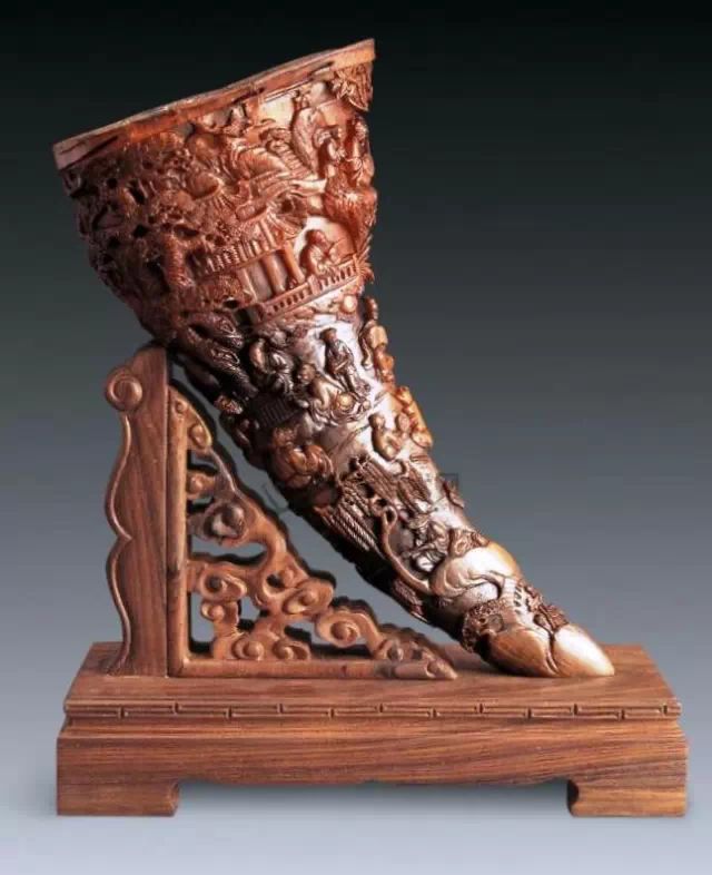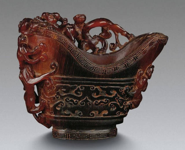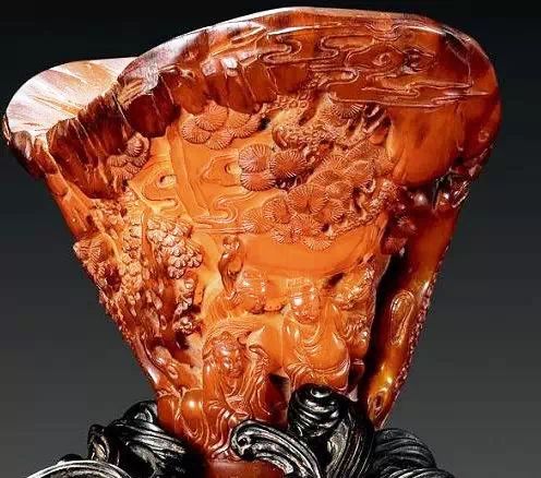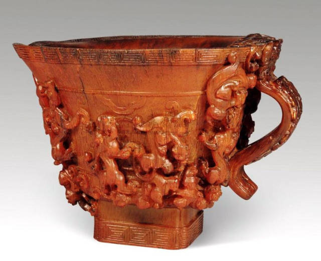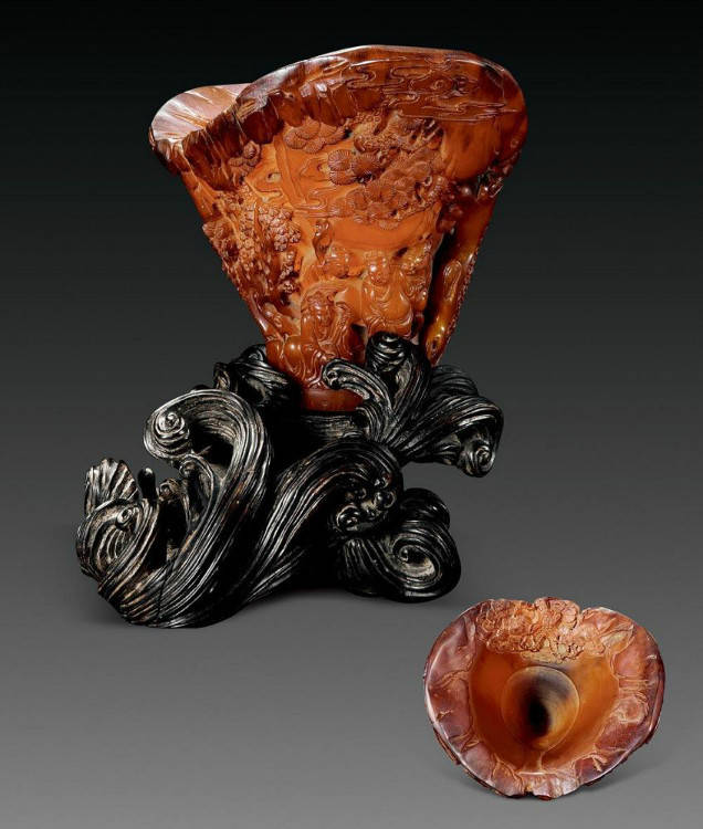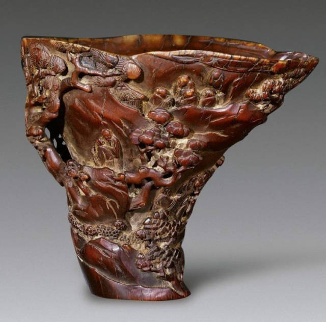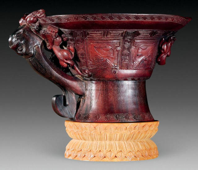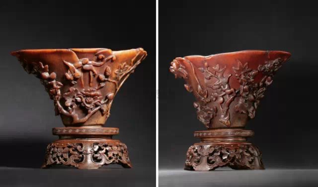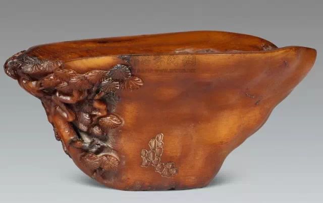 清初的犀角雕刻继承明代的传统风格。因明末着名的牙角雕刻家仍继续从事雕刻工艺。雕刻蟠螭纹和龙纹的犀角杯数量增多。进入乾隆朝,犀角雕的器形种类颇丰,除杯外,有圆雕人物、洗、挂件及仿古器形爵、鼎、羽觞等,雕刻工艺精致至极。清后期,犀角料进口减少,且主要作药材,犀角雕刻艺术遂走向衰落。 (清 犀角花瓣纹碗连象牙底座) 001-清 犀角雕螭龙饕餮纹酒杯 长16.1cm;宽8.9cm;高9.1cm 用十八世纪东南亚犀牛角雕琢而成。色泽浅灰黄色,角尖较深,呈灰褐色。杯呈九瓣花形。口部近椭圆形,流部较宽,窄部透雕螭龙纹把。椭圆形小圈足也呈九瓣花形。虽以花瓣为形,纹饰上却仿古,仿商用青铜器上纹饰。口沿内外和足墙阴刻回纹,身部以阴刻回纹为地雕饰平凸的饕餮纹,并高浮雕两条威猛的螭龙,胫部浅浮雕叶脉纹。清廷匠师将花形和仿古两种主要的犀角杯造型巧妙地融合在一起。犀角具清热消毒,止血滋补之良效,清代宫廷多将其制成酒杯以强身祛病。 002-清中期 雕螭龙犀角杯 003-清 犀角雕龙纹杯 高12cm-RMB 3450000 整器以犀角雕刻而成,呈褐色。敞口斜腹,腹部利用角料自身的凹凸,外壁及口沿浮雕琢出螭龙做成把手,浮雕图案延伸到杯口沿的内侧。雕刻精细,浮雕与刻琢结合,突出了纹饰层次。杯下腹部两侧以祥云、草木等饰之,并雕刻出三层纹饰。整个犀角杯大气沉稳,透出盈盈古意。 004-清•犀角杯 高:8cm重:178克-RMB 246400 以整块犀角制成,角制细润,颜色褐红,包浆厚重润泽。角杯内外口沿处为一圈回纹。杯身中部亦以回纹为地,其上浮雕青铜器之夔龙纹。角杯一边为一高浮雕变形螭龙。爬于角杯口沿,螭龙面部以简洁的设计与刀工琢刻出觊觎酒杯的螭龙面孔。腿足刻饰为云纹,使角杯显得更加生动活泼。 005-清 犀角螭龙纹杯 长18cm;重865克,有裂-RMB 782000 006-清 犀角螭龙杯 宽14.5cm,470g-RMB 690000 杯敞口,造型仿自青铜酒器,整器以整支犀角雕成,取料硕大,色范红褐,包浆温润。内沿处刻回纹,杯身以饰以三层纹饰,自上而下为回纹,浅浮雕兽面纹为地的圆雕夔龙纹和蕉叶纹,只见夔龙攀附于杯身之上,龙头探入杯内,身形灵动,另有几条小龙攀附其间,层次分明,起伏有度,形象生动;与之对应的另一边口沿亦高浮雕小螭龙三条,翻转自如,雕工细腻,栩栩如生。全器包浆温润,阴刻、透雕、浮雕等技法并用,线条流畅,作品静中显动。 007-清 犀角仿古铜杯 高7.5cm-160,000-240,000 008-清 犀角雕螭虎杯 长13cm;高10cm-RMB 300,000-400,000 009-清 雕龙纹犀角杯 6×8cm-RMB 126500 010-清 犀角雕饕餮螭龙杯 高15.8cm,437g,象牙座-RMB 300,000-300,000 011-清 犀角雕夔龙螭虎杯 长13.8cm,重约470克-RMB 287500 犀角自古在我国就已十分珍贵,而犀角雕刻品更是被誉为奇珍异宝,被皇室贵胄和达官贵人用以炫耀财富。其多随形雕作酒杯,不仅造型精美,且因犀角本为名贵药材,故而更显其优。此件犀角杯材质凝透,包浆润泽,轮廓线圆滑柔和,纹饰古雅适度,颇具古韵,为清代十分难得的精品。且杯身螭龙刻画得气势恢宏,苍劲有力,精巧华美,极富艺术表现力,颇具收藏价值。 012-清 犀角雕兽面纹杯 013-清 犀角螭龙小杯 014-清•犀角雕长安乐宜子孙款爵杯 高:14.1cm 重:188g-RMB 575000 015- 清 犀角雕山水人物纹爵形杯 直径16.2cm×高15.3cm,重1100克,带紫檀海水纹座;RMB 392000 犀角雕,通体主要采用浮雕,镂雕技艺,将苍松雕成柄,且上连杯口下至底足,枝头攀附过强入于杯口内壁,古趣横生,春意盎然。外壁浮雕饮马图,仿自赵孟俯之饮马图。此杯将圆雕、浮雕、镂雕等技法融为一体,莹然欲透,刻工高超,刀法精绝,纹饰细密精美,既有仿古格调,又有创新的意境,为犀角雕刻的精品。 角雕是用兽角雕刻和磨制而成的工艺品。清代,由于工艺美术突飞猛进的发展,雕刻工艺达到了一个新的高峰,精湛的雕刻艺术扩展到犀角材质中来,这样,形状众多,花纹各异的犀角杯就脱颖而出,闻名于世。 所配之底座,乃小叶紫檀材质,质地细腻,通体镂雕海浪纹,以护固杯身,别致精巧,古朴典雅。此犀角杯工艺精湛无比,所雕诸景生动逼真,富具立体感,为清代雕刻不可多得的绝妙佳品,弥足珍贵。 016-清 犀角山水人物杯 重100.9g 犀角杯的雕刻,首先要根据它原材料的形状条件,此杯选用上等犀角为材料,缜密构图。采用高浮雕技法,雕刻一幅山水人物图,老者携童子泛舟于湖水之上,对岸一老者坐于树下,周围竹林茂盛、苍松挺立。将一幅优美闲逸的山水人物画跃然于此杯之上。细部刻画极为精细,人物表情生动,充分体现了其高超的技法,整件犀角杯风格古朴雅致,是件难得的清代犀角精品。 017-清 犀角雕高士雅集纹杯 高9cm;重190克-RMB 649600 杯为犀牛角制成,色如深色琥珀,有着一层柔美的琥珀光泽,富有灵气。此杯采用浅浮雕、深浮雕、镂雕和圆雕的等多种雕刻工艺手法,层次分明,错落有致,作工精细,显示了作者精湛的工艺水平,当为犀角中的精品。其画面置于深山老林间,作者以通寻的方式,将杯镂雕成二三层,苍松耸立,松枝直入杯口之入,曲折婉转,杯璧上,小路蜿蜒,直入杯底,松柏、桐树、枫树、间插在山岩之间,虬枝怒干、雄健苍劲、老林古松,参天敞日,极具幽静之意,山间崇山峻岭间隐约露出亭台楼阁,似通往人间仙境,杯底深圆,角质细润密实,在不惜浪费珍贵的犀角材料,运刀流畅,刀锋犀利,画面生动,令人叫绝,是犀角雕刻中极高趣味的作品。 018-清 犀角雕山水人物杯 宽12.7cm-R