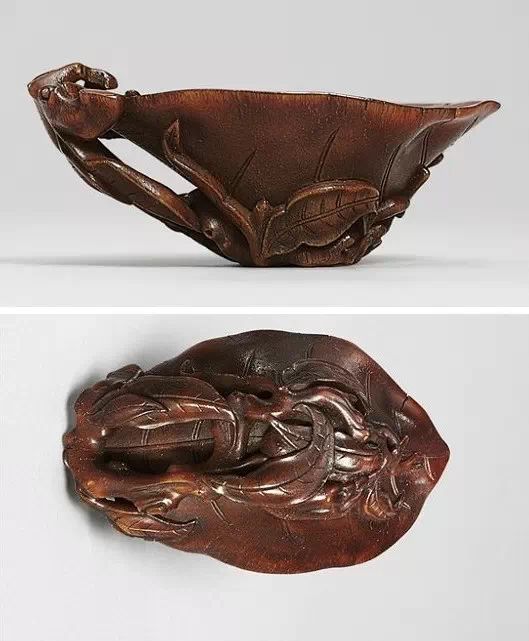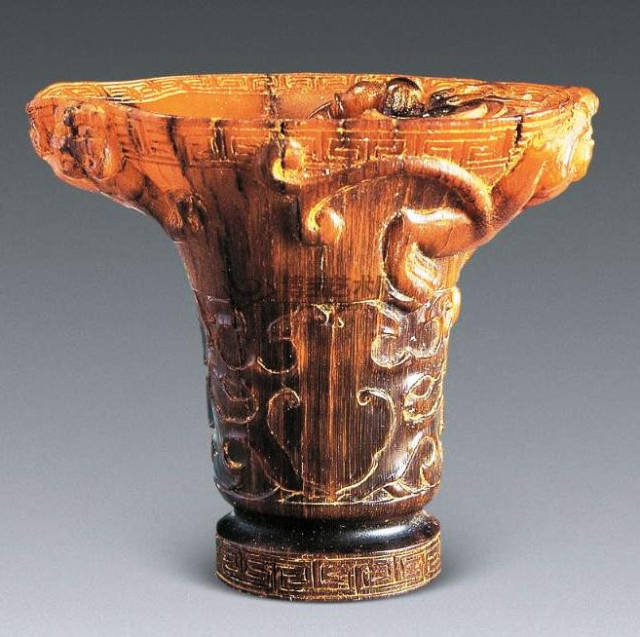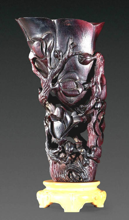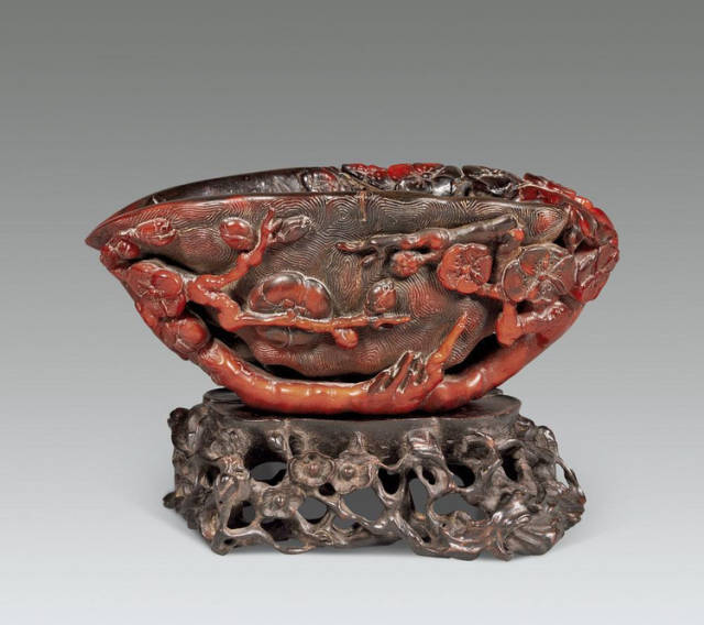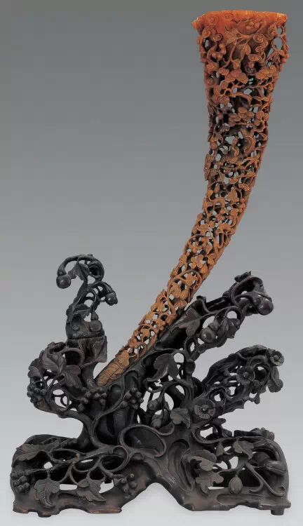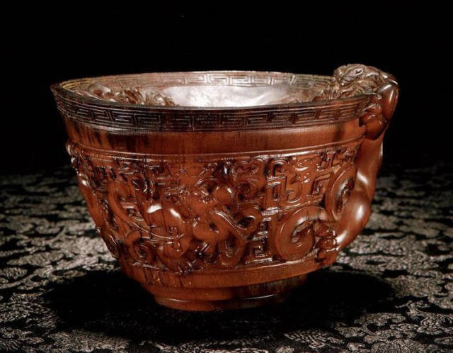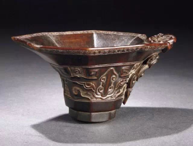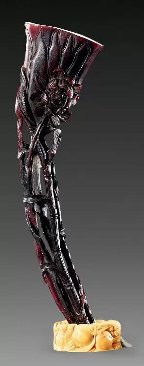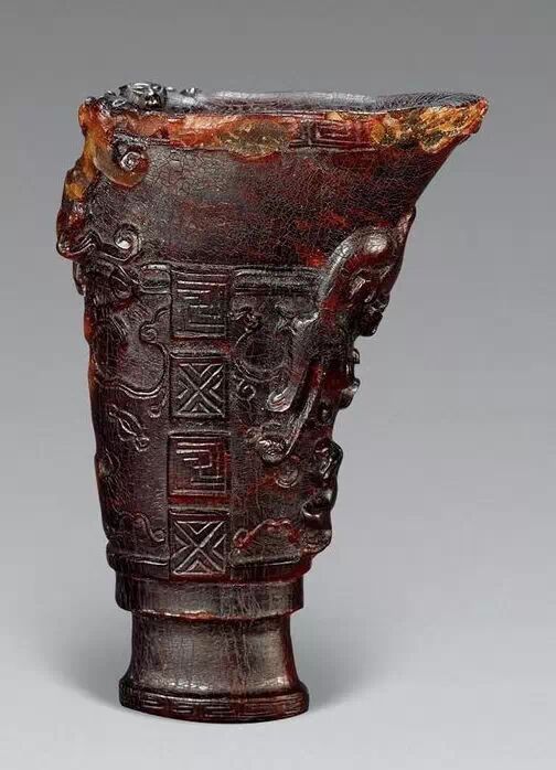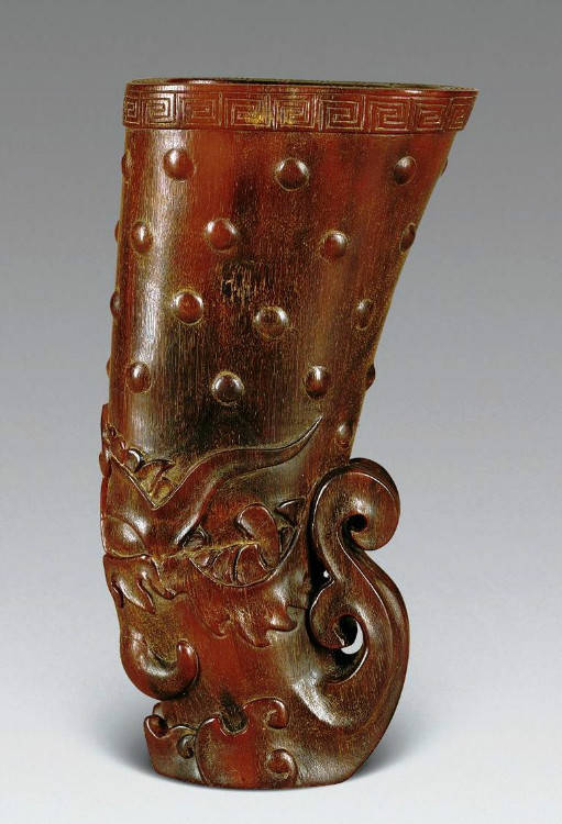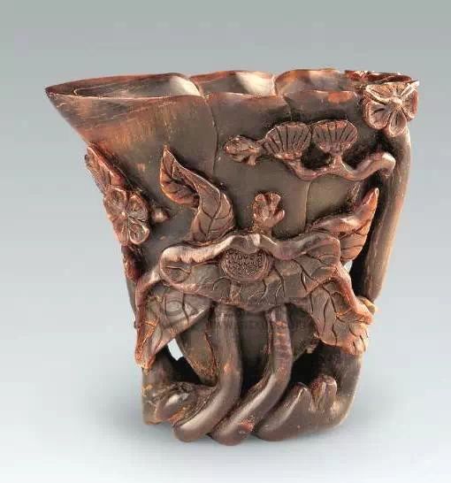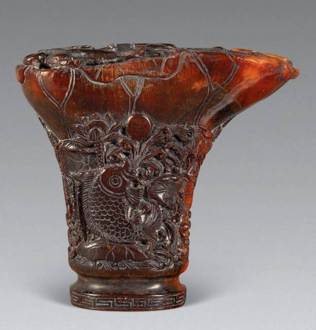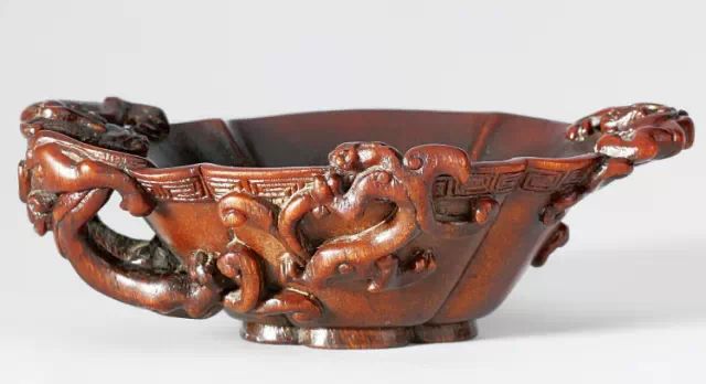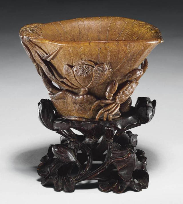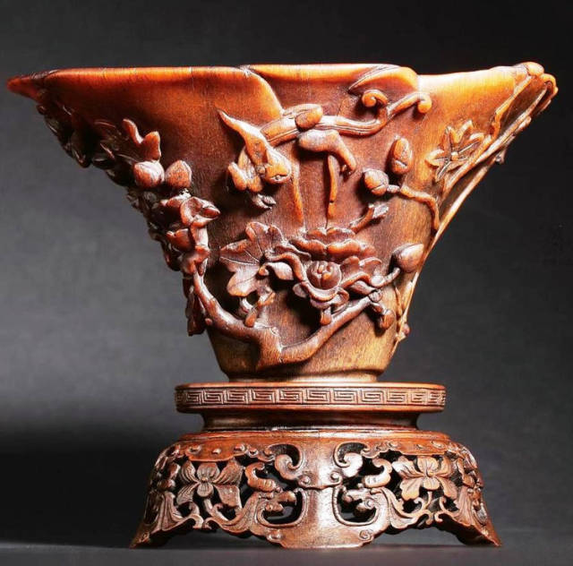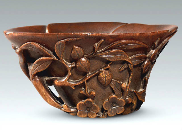 清初的犀角雕刻继承明代的传统风格。因明末着名的牙角雕刻家仍继续从事雕刻工艺。雕刻蟠螭纹和龙纹的犀角杯数量增多。进入乾隆朝,犀角雕的器形种类颇丰,除杯外,有圆雕人物、洗、挂件及仿古器形爵、鼎、羽觞等,雕刻工艺精致至极。清后期,犀角料进口减少,且主要作药材,犀角雕刻艺术遂走向衰落。 (清 犀角花瓣纹碗连象牙底座) 001-清 犀角雕螭龙饕餮纹酒杯 长16.1cm;宽8.9cm;高9.1cm 用十八世纪东南亚犀牛角雕琢而成。色泽浅灰黄色,角尖较深,呈灰褐色。杯呈九瓣花形。口部近椭圆形,流部较宽,窄部透雕螭龙纹把。椭圆形小圈足也呈九瓣花形。虽以花瓣为形,纹饰上却仿古,仿商用青铜器上纹饰。口沿内外和足墙阴刻回纹,身部以阴刻回纹为地雕饰平凸的饕餮纹,并高浮雕两条威猛的螭龙,胫部浅浮雕叶脉纹。清廷匠师将花形和仿古两种主要的犀角杯造型巧妙地融合在一起。犀角具清热消毒,止血滋补之良效,清代宫廷多将其制成酒杯以强身祛病。 002-清中期 雕螭龙犀角杯 003-清 犀角雕龙纹杯 高12cm-RMB 3450000 整器以犀角雕刻而成,呈褐色。敞口斜腹,腹部利用角料自身的凹凸,外壁及口沿浮雕琢出螭龙做成把手,浮雕图案延伸到杯口沿的内侧。雕刻精细,浮雕与刻琢结合,突出了纹饰层次。杯下腹部两侧以祥云、草木等饰之,并雕刻出三层纹饰。整个犀角杯大气沉稳,透出盈盈古意。 004-清•犀角杯 高:8cm重:178克-RMB 246400 以整块犀角制成,角制细润,颜色褐红,包浆厚重润泽。角杯内外口沿处为一圈回纹。杯身中部亦以回纹为地,其上浮雕青铜器之夔龙纹。角杯一边为一高浮雕变形螭龙。爬于角杯口沿,螭龙面部以简洁的设计与刀工琢刻出觊觎酒杯的螭龙面孔。腿足刻饰为云纹,使角杯显得更加生动活泼。 005-清 犀角螭龙纹杯 长18cm;重865克,有裂-RMB 782000 006-清 犀角螭龙杯 宽14.5cm,470g-RMB 690000 杯敞口,造型仿自青铜酒器,整器以整支犀角雕成,取料硕大,色范红褐,包浆温润。内沿处刻回纹,杯身以饰以三层纹饰,自上而下为回纹,浅浮雕兽面纹为地的圆雕夔龙纹和蕉叶纹,只见夔龙攀附于杯身之上,龙头探入杯内,身形灵动,另有几条小龙攀附其间,层次分明,起伏有度,形象生动;与之对应的另一边口沿亦高浮雕小螭龙三条,翻转自如,雕工细腻,栩栩如生。全器包浆温润,阴刻、透雕、浮雕等技法并用,线条流畅,作品静中显动。 007-清 犀角仿古铜杯 高7.5cm-160,000-240,000 008-清 犀角雕螭虎杯 长13cm;高10cm-RMB 300,000-400,000 009-清 雕龙纹犀角杯 6×8cm-RMB 126500 010-清 犀角雕饕餮螭龙杯 高15.8cm,437g,象牙座-RMB 300,000-300,000 011-清 犀角雕夔龙螭虎杯 长13.8cm,重约470克-RMB 287500 犀角自古在我国就已十分珍贵,而犀角雕刻品更是被誉为奇珍异宝,被皇室贵胄和达官贵人用以炫耀财富。其多随形雕作酒杯,不仅造型精美,且因犀角本为名贵药材,故而更显其优。此件犀角杯材质凝透,包浆润泽,轮廓线圆滑柔和,纹饰古雅适度,颇具古韵,为清代十分难得的精品。且杯身螭龙刻画得气势恢宏,苍劲有力,精巧华美,极富艺术表现力,颇具收藏价值。 012-清 犀角雕兽面纹杯 013-清 犀角螭龙小杯 014-清•犀角雕长安乐宜子孙款爵杯 高:14.1cm 重:188g-RMB 575000 015- 清 犀角雕山水人物纹爵形杯 直径16.2cm×高15.3cm,重1100克,带紫檀海水纹座;RMB 392000 犀角雕,通体主要采用浮雕,镂雕技艺,将苍松雕成柄,且上连杯口下至底足,枝头攀附过强入于杯口内壁,古趣横生,春意盎然。外壁浮雕饮马图,仿自赵孟俯之饮马图。此杯将圆雕、浮雕、镂雕等技法融为一体,莹然欲透,刻工高超,刀法精绝,纹饰细密精美,既有仿古格调,又有创新的意境,为犀角雕刻的精品。 角雕是用兽角雕刻和磨制而成的工艺品。清代,由于工艺美术突飞猛进的发展,雕刻工艺达到了一个新的高峰,精湛的雕刻艺术扩展到犀角材质中来,这样,形状众多,花纹各异的犀角杯就脱颖而出,闻名于世。 所配之底座,乃小叶紫檀材质,质地细腻,通体镂雕海浪纹,以护固杯身,别致精巧,古朴典雅。此犀角杯工艺精湛无比,所雕诸景生动逼真,富具立体感,为清代雕刻不可多得的绝妙佳品,弥足珍贵。 016-清 犀角山水人物杯 重100.9g 犀角杯的雕刻,首先要根据它原材料的形状条件,此杯选用上等犀角为材料,缜密构图。采用高浮雕技法,雕刻一幅山水人物图,老者携童子泛舟于湖水之上,对岸一老者坐于树下,周围竹林茂盛、苍松挺立。将一幅优美闲逸的山水人物画跃然于此杯之上。细部刻画极为精细,人物表情生动,充分体现了其高超的技法,整件犀角杯风格古朴雅致,是件难得的清代犀角精品。 017-清 犀角雕高士雅集纹杯 高9cm;重190克-RMB 649600 杯为犀牛角制成,色如深色琥珀,有着一层柔美的琥珀光泽,富有灵气。此杯采用浅浮雕、深浮雕、镂雕和圆雕的等多种雕刻工艺手法,层次分明,错落有致,作工精细,显示了作者精湛的工艺水平,当为犀角中的精品。其画面置于深山老林间,作者以通寻的方式,将杯镂雕成二三层,苍松耸立,松枝直入杯口之入,曲折婉转,杯璧上,小路蜿蜒,直入杯底,松柏、桐树、枫树、间插在山岩之间,虬枝怒干、雄健苍劲、老林古松,参天敞日,极具幽静之意,山间崇山峻岭间隐约露出亭台楼阁,似通往人间仙境,杯底深圆,角质细润密实,在不惜浪费珍贵的犀角材料,运刀流畅,刀锋犀利,画面生动,令人叫绝,是犀角雕刻中极高趣味的作品。 018-清 犀角雕山水人物杯 宽12.7cm-R
