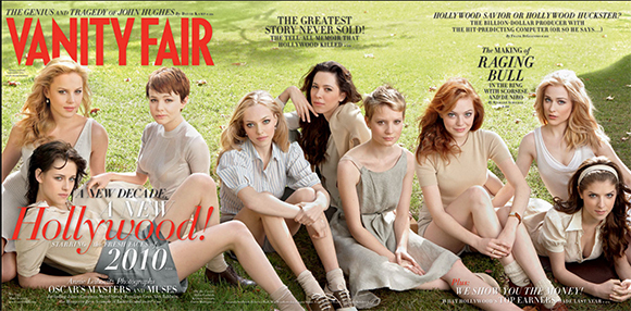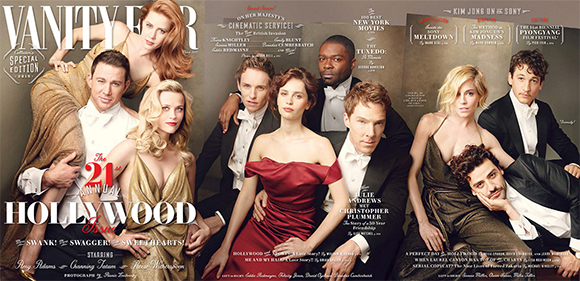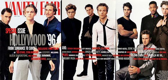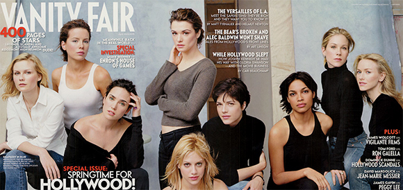 从 1995 年开始,《名利场》杂志每年 3 月号或 4 月号都会做一期好莱坞特刊。由御用摄影师 Annie Leibovitz 操刀,请来数位当红好莱坞明星来拍摄 3 联的大跨页封面。同时大跨页明星大合影,《名利场》的封面比数月前另一本中国时尚杂志要高明许多。