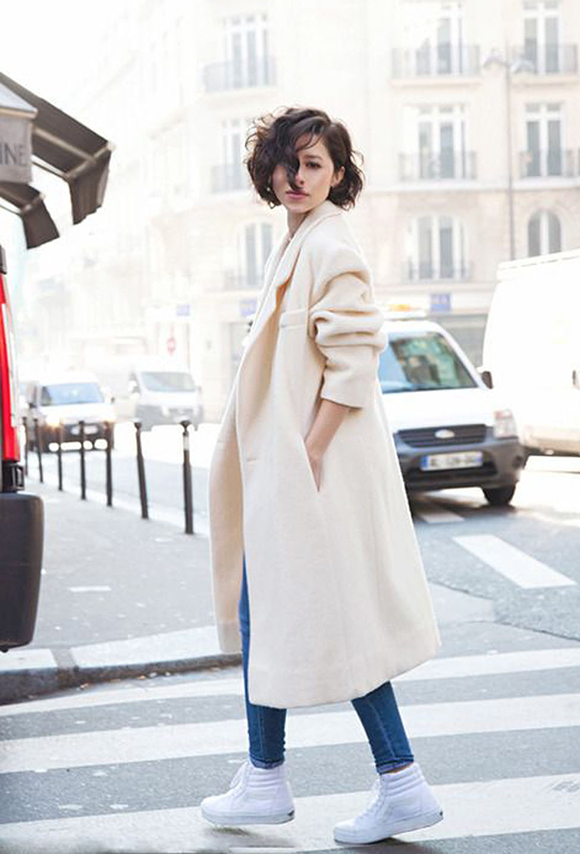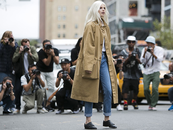 大尺寸外套显小只不言而喻。比方下图在纽约街头被围堵的 Ola Rudnicka,就是用一件 oversized 大衣把少女气鼓了起来。
