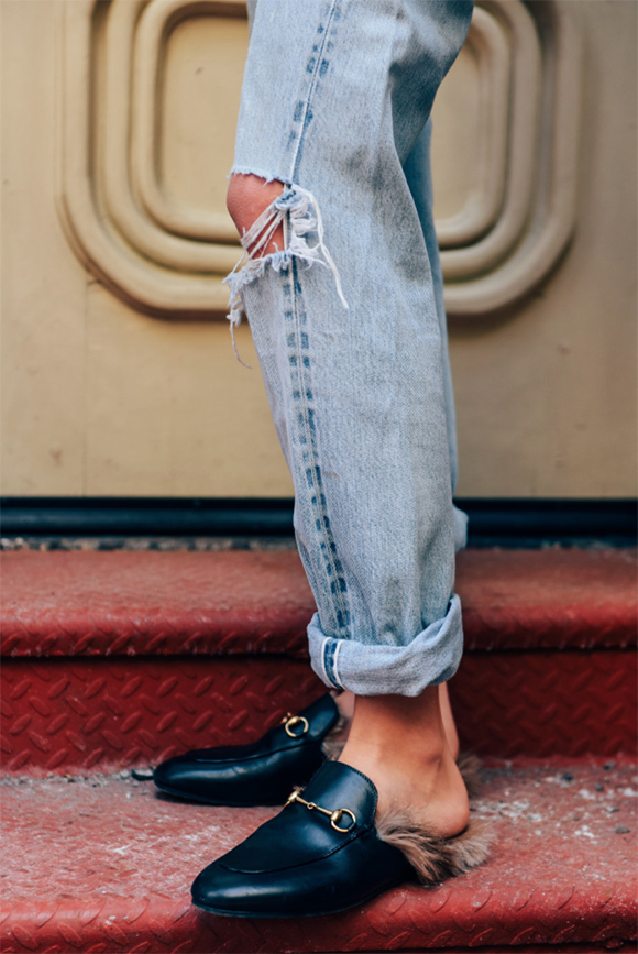最轻巧的年轻化暴露就是截腿,比如 Tommy Ton 前不久街拍的破洞牛仔裤: