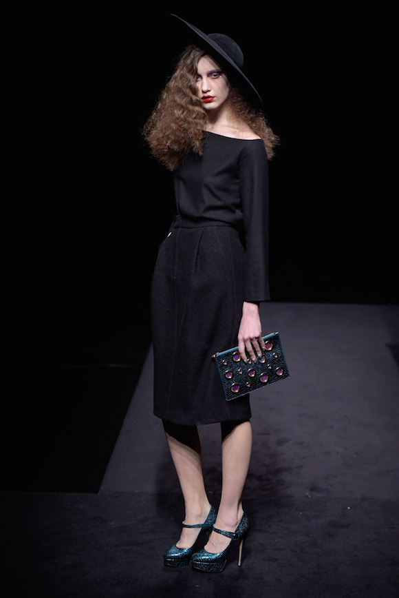 Evans 的设计让人不禁联想到西班牙斗牛士,这从上衣肩膀处的廓形处理,到极度收窄的下身造型里都能看出些端倪。另外,整个系列采用黑、红、白、藏青等颜色为主色调,也能引起观众关于斗牛士的联想。还有一点值得一说,该系列通过手工针织做出的布料,质感上乘,加上颜色的运用恰当,整个系列在整体审美上又提升了一大步。
