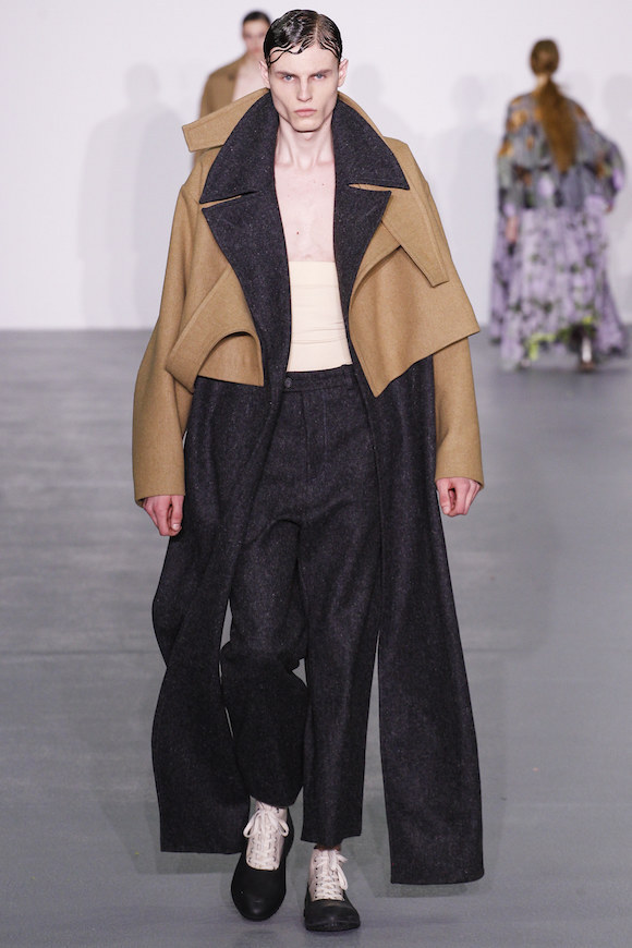 Skelton 的设计则颇有些工业革命时期工人穿衣打扮的味道,不过这些工人更像是受过良好教育的贵族式工人。这听上去有些矛盾,但在造型和选材上都做出夸张处理的工人帽,以及在工装式的成衣上进行的刺绣,都让这两个矛盾事物在现代背景下合理地结合在了一起。对了,根据颁奖词,这一整个系列还使用了环保材料,充分考虑到了时尚和可持续性间的平衡。