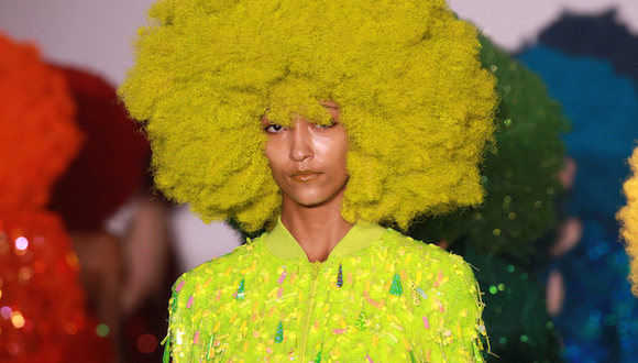 34 个模特,每人一个专属颜色——她们需要穿戴同色的蘑菇云假发、亮片套装以及高跟鞋,绕场一周。对了,她们的口红和指甲油颜色也是专属色。