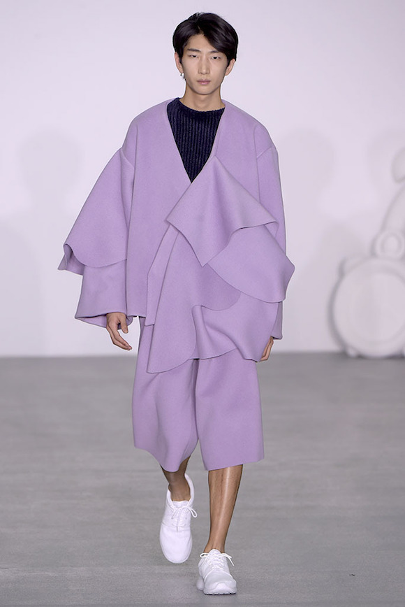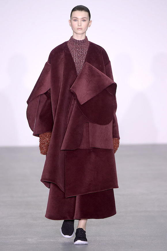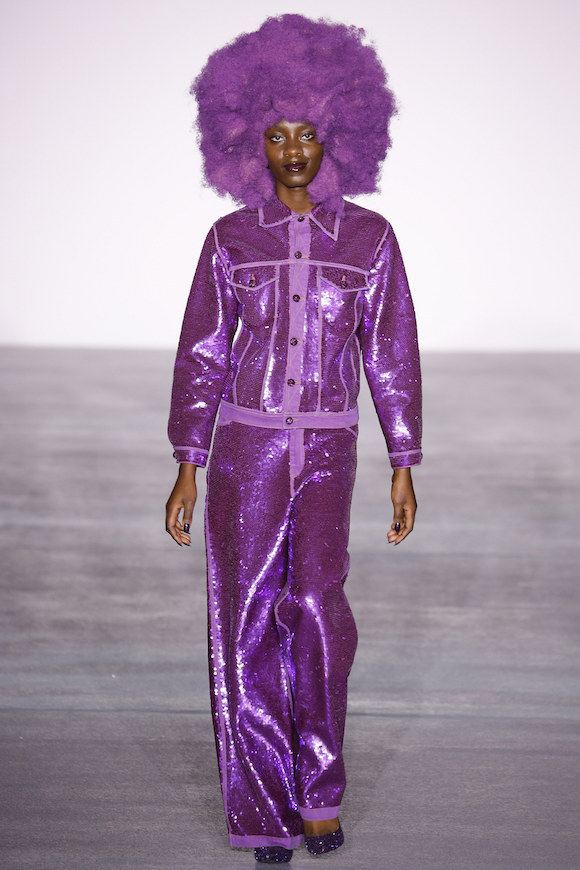 如果看到这里还觉得主题不够明确,Pugh在秀的最后找来了两位男模陪同一位穿着绒面超大垫肩大衣的女模霸气巡场,而她们行进时的背景声配的是“I’m a man-eating machine.(我是一个吃男人的机器。)”