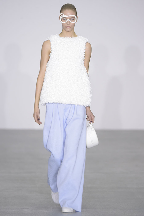还有比这更有趣的吗?每个人单看是一幅景,排队出场的时候更是可以预见的壮观。不过,你可能会担心这样的亮片造型会低俗,或者说过于夸张。实际上,设计师将个中分寸拿捏得恰到好处,首先颜色的选择就很慎重,再加上成熟的剪裁和制版工艺,其实单拿出来,不少都是非常实穿又吸睛的单品。