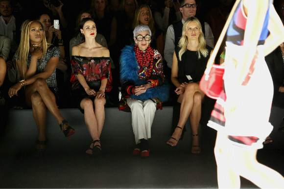 她和老佛爷 Karl Lagerfeld 一样,拥有超高的辨识度。这里指得不仅是鹤发童颜,还有她对装束永不懈怠的劲头。无论是看秀、拍片,还是接受采访,Iris Apfel 鼻梁上总架着一副覆盖全脸三分之二的超大款眼镜、身上充斥着大面积跳跃色彩、指尖与手腕则满是层叠搭配的饰品......这幅在常人眼中夸张至极的打扮让她跻身 2013 年度最会穿搭的时尚年长人士(50 岁以上)。同样上榜的包括前法国版 Vogue 主编 Carine Roitfeld、时年 51 岁的设计师 Tom Ford、Prada 创始人 Miuccia Prada 等。