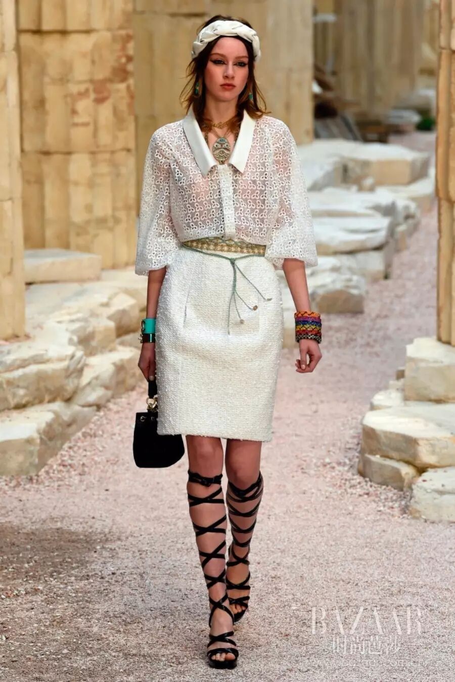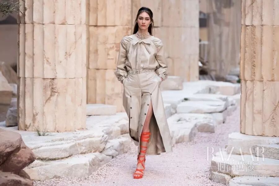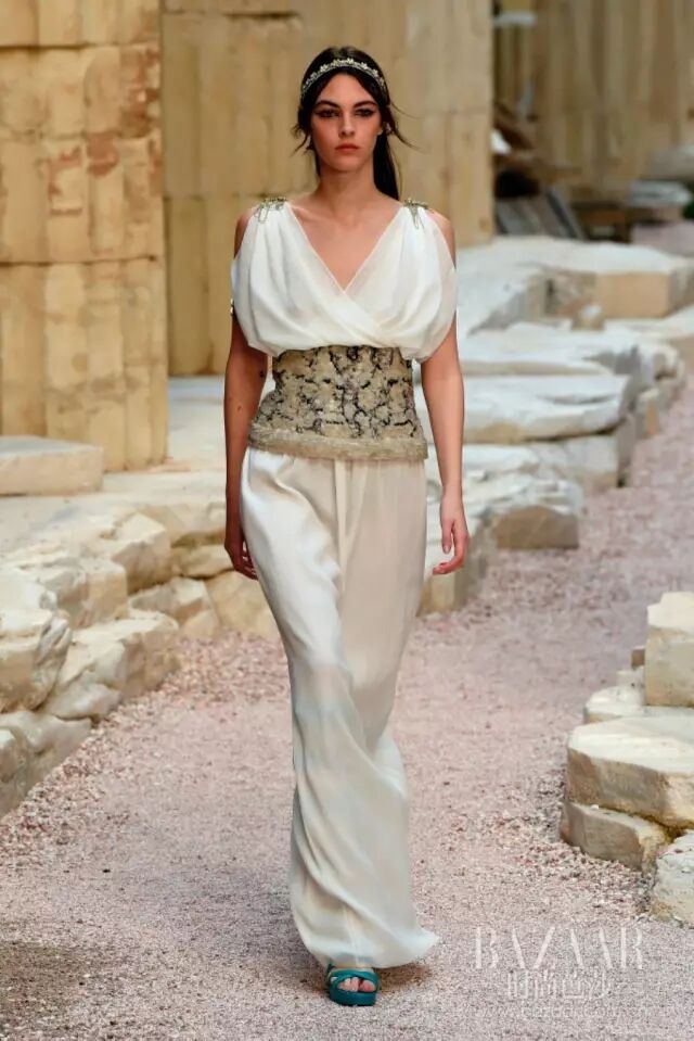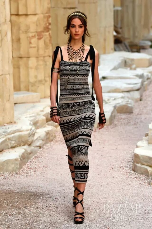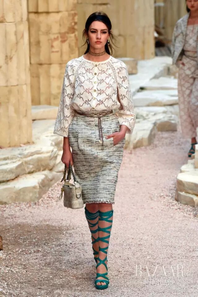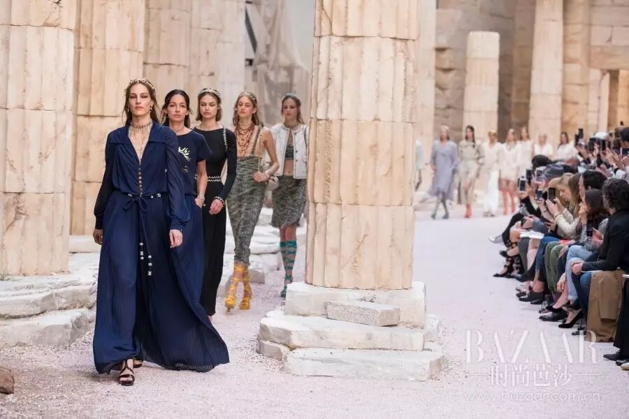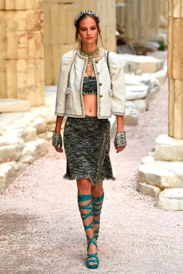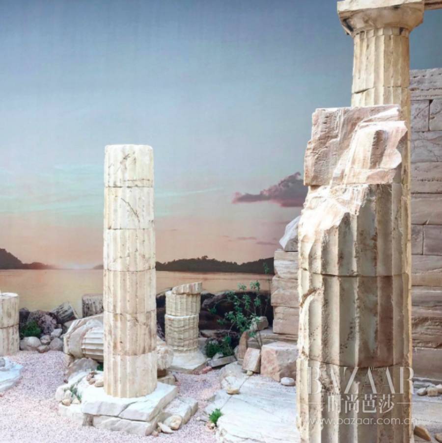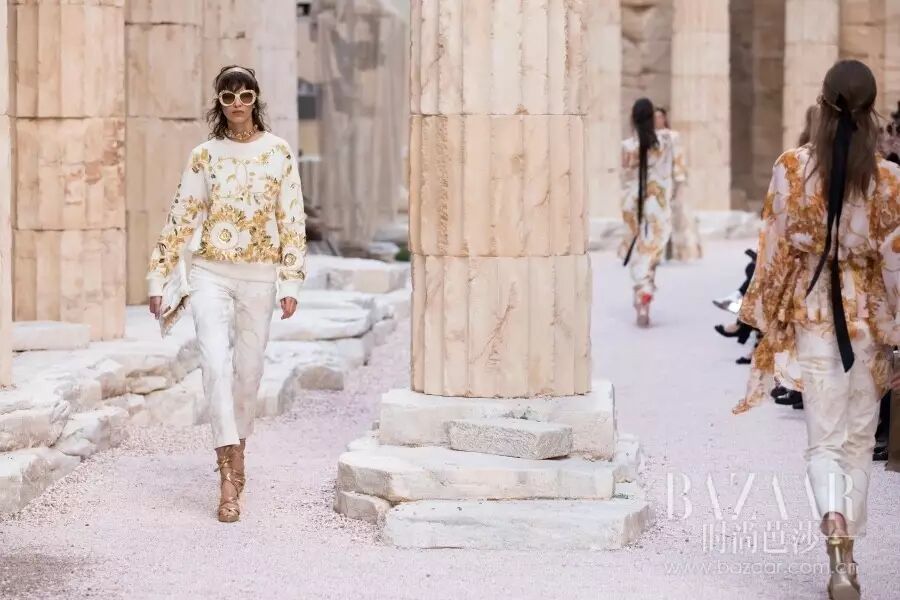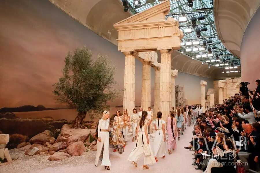 Chanel 营造了古希腊残垣庙宇的场景,华丽庄严的多立克柱石林立在秀场中央,模特们行走其中,描绘出典雅美丽的女性形象。