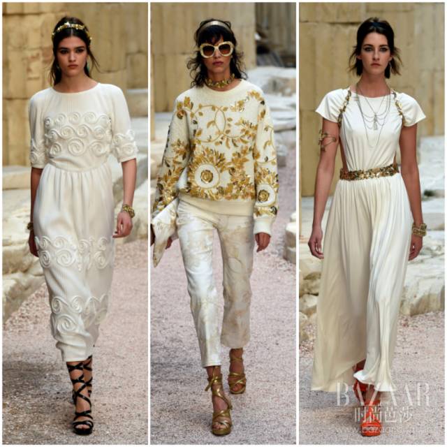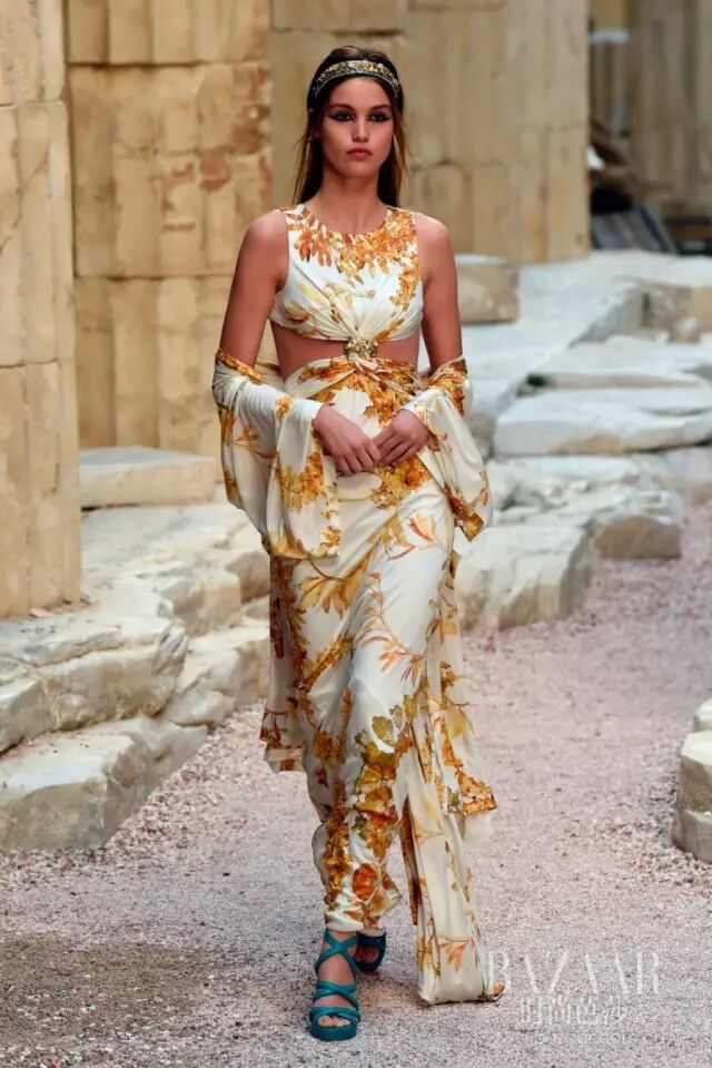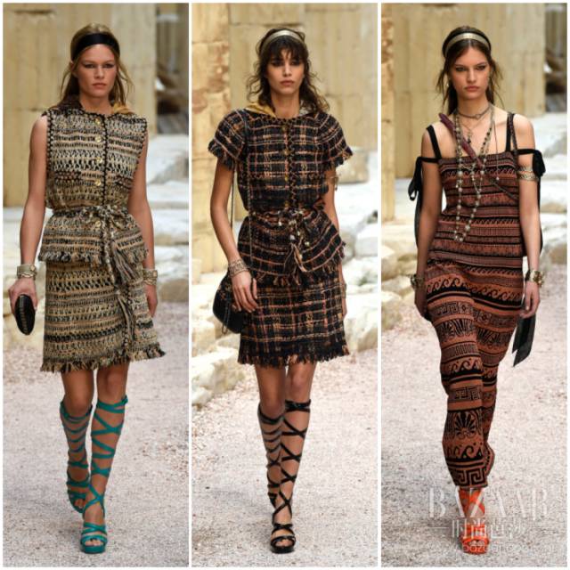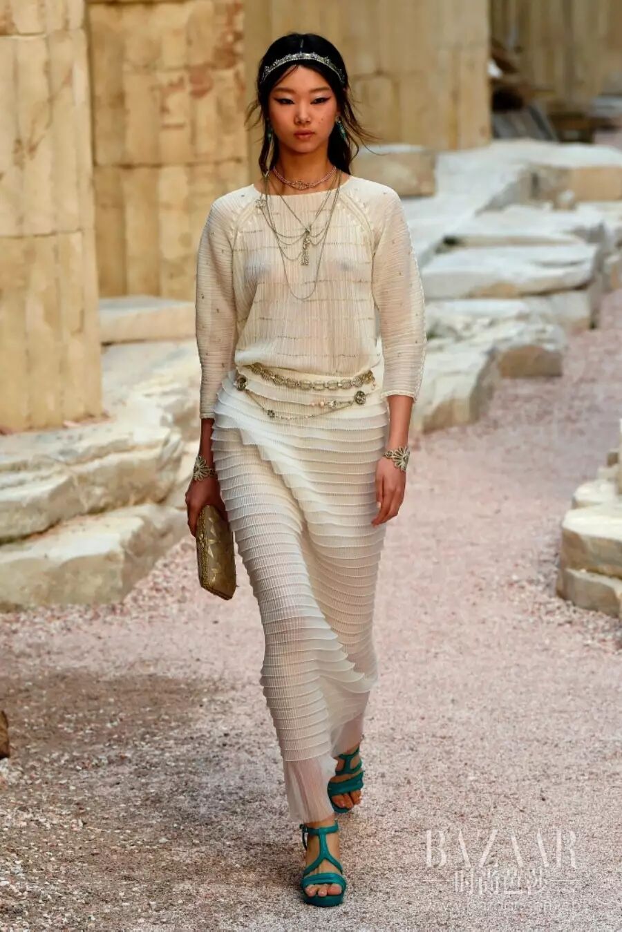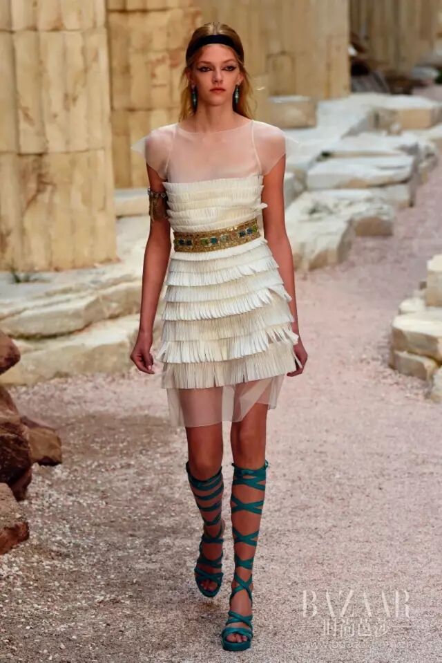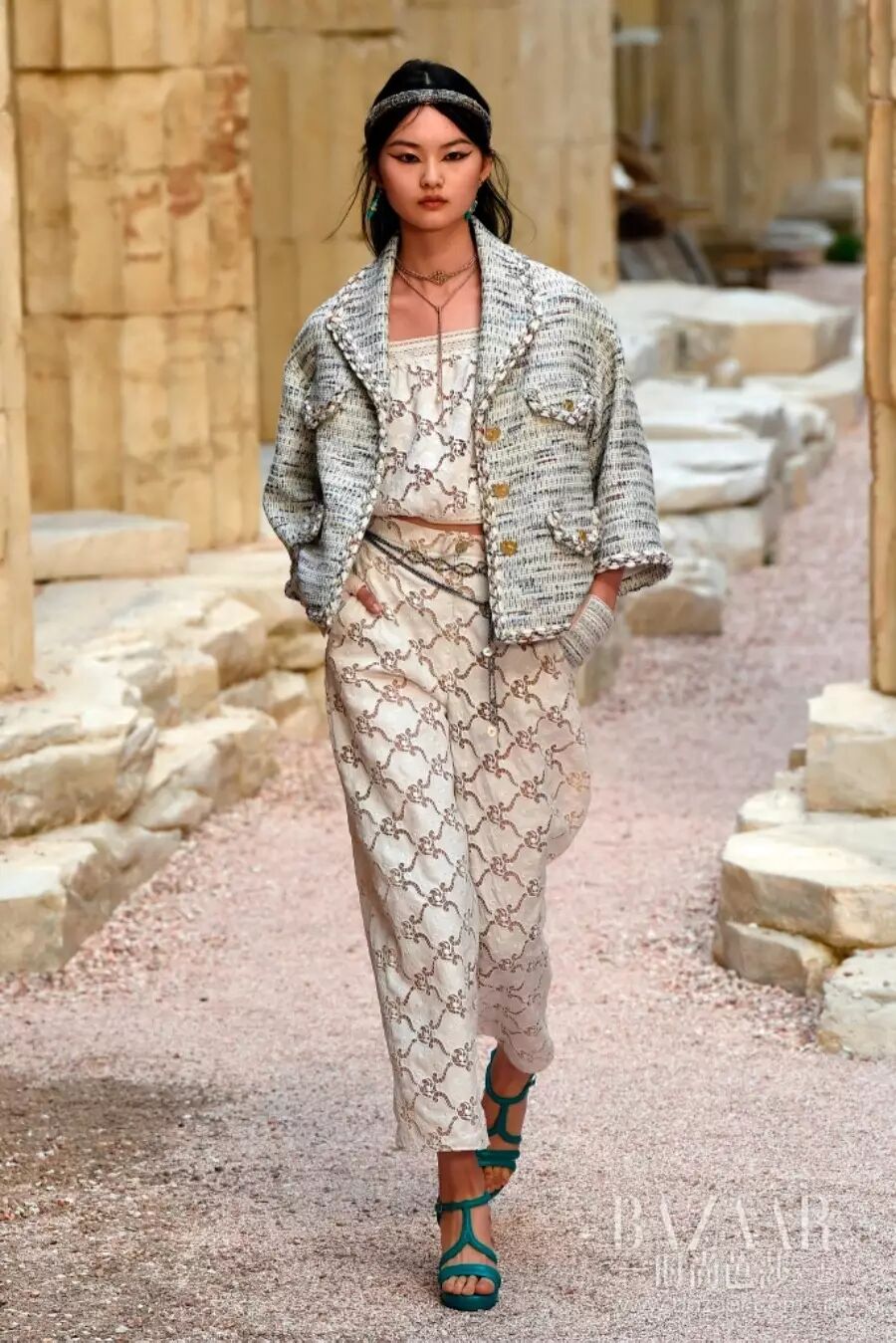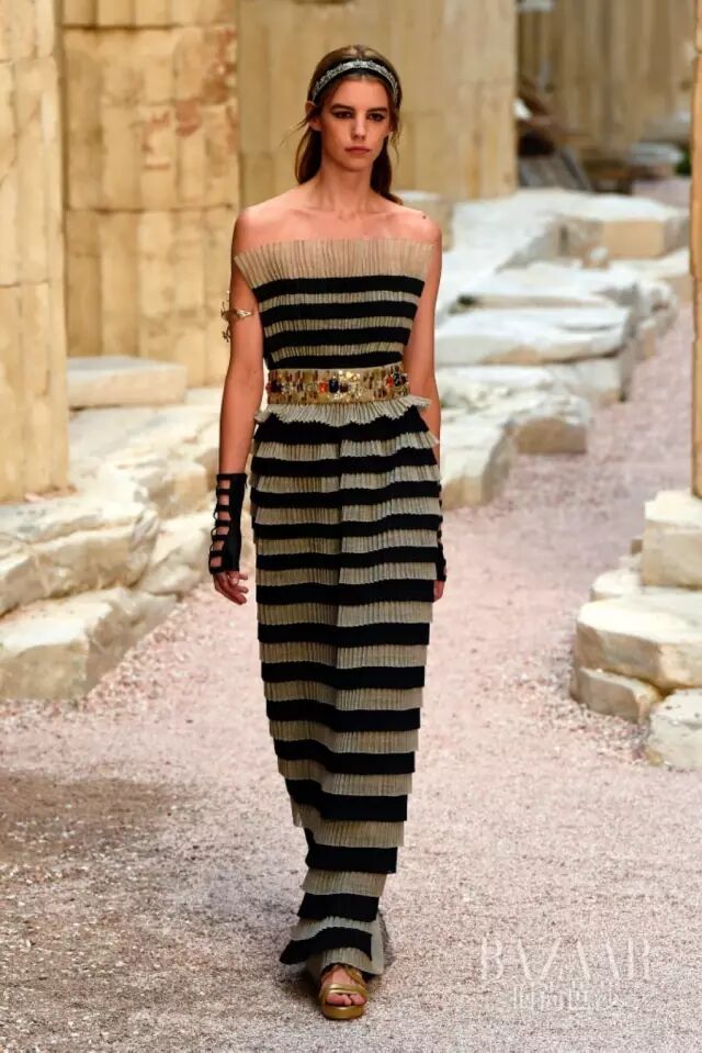 Chanel 营造了古希腊残垣庙宇的场景,华丽庄严的多立克柱石林立在秀场中央,模特们行走其中,描绘出典雅美丽的女性形象。