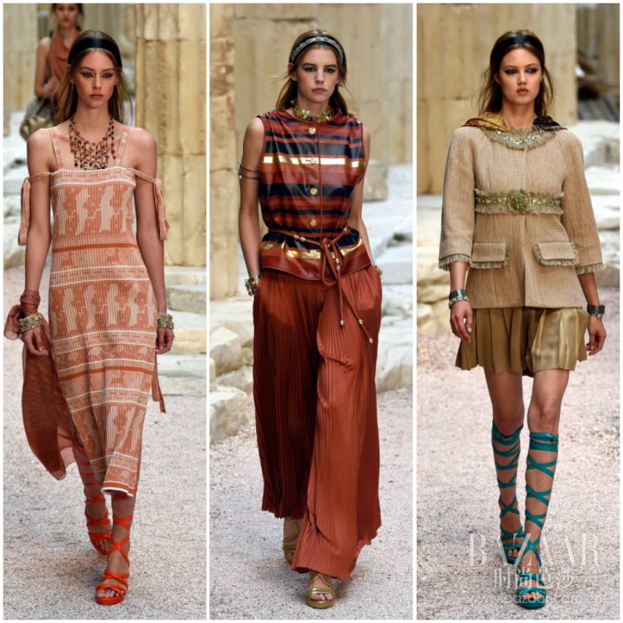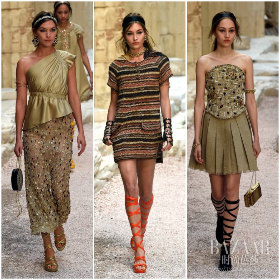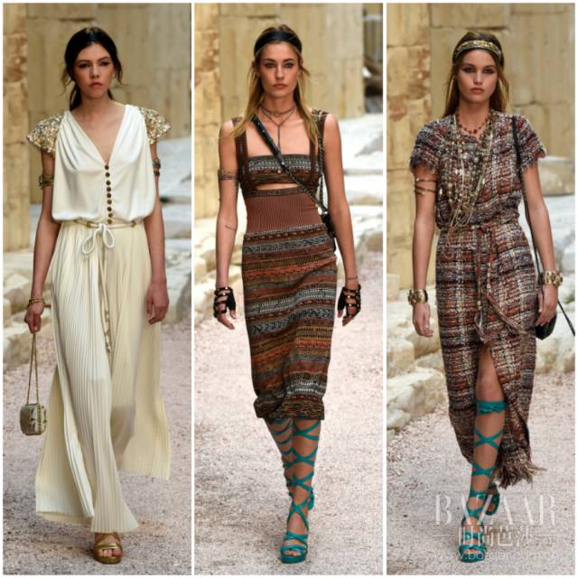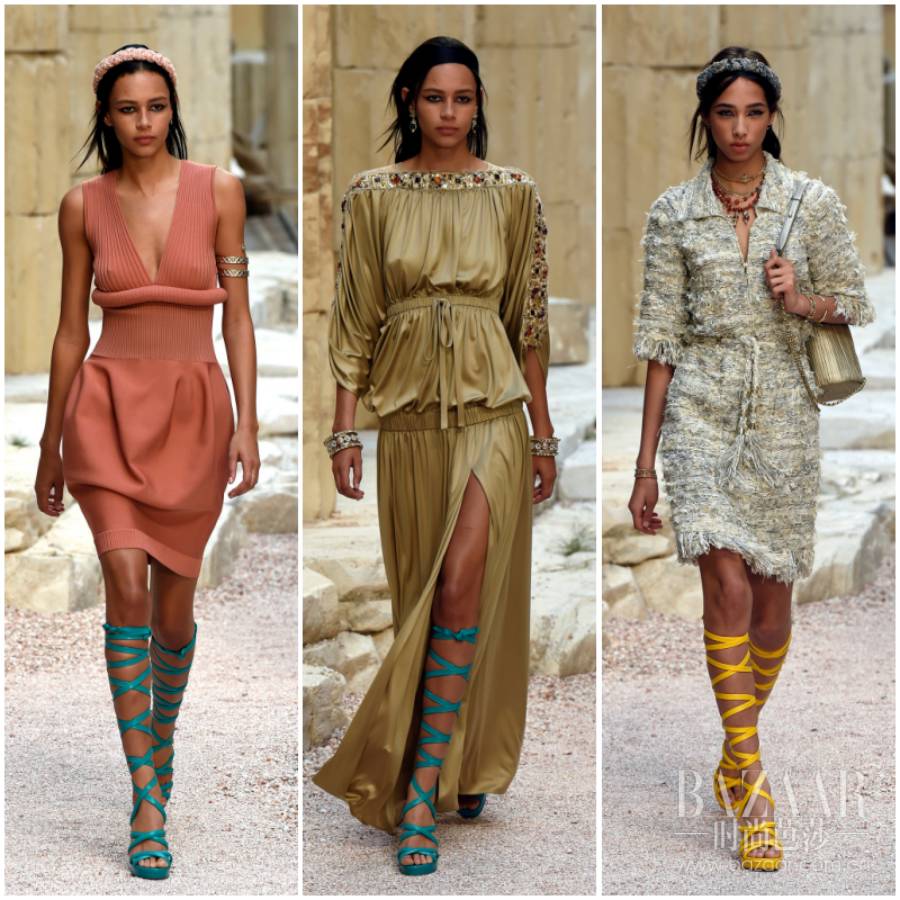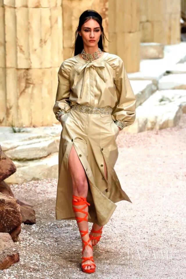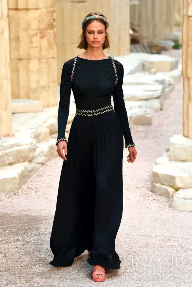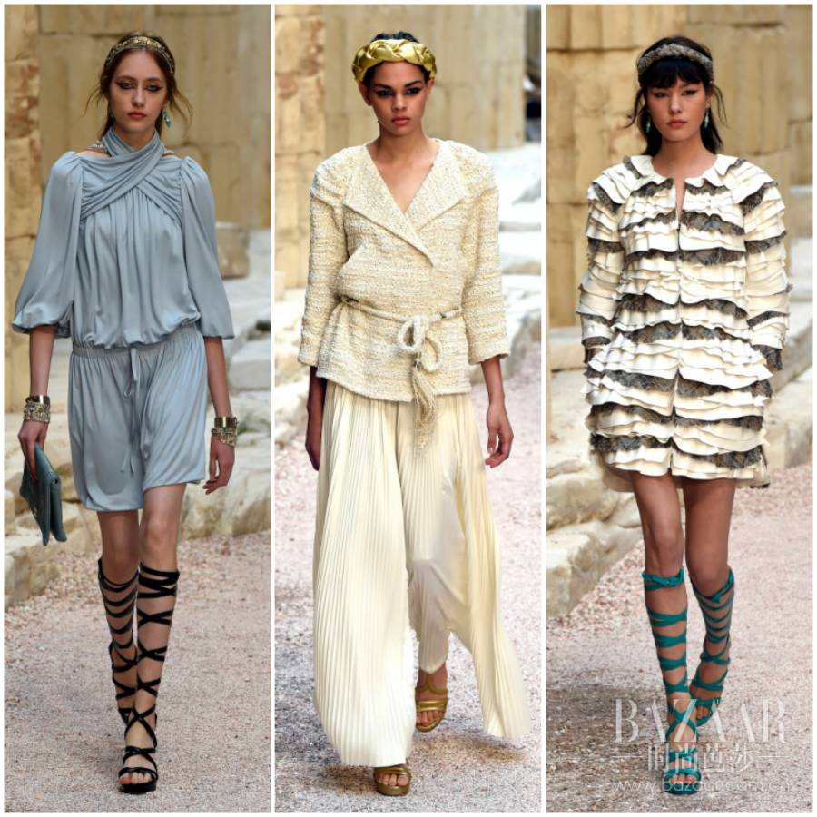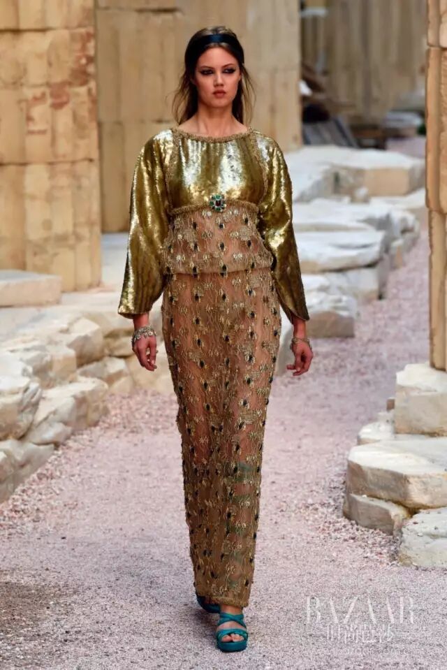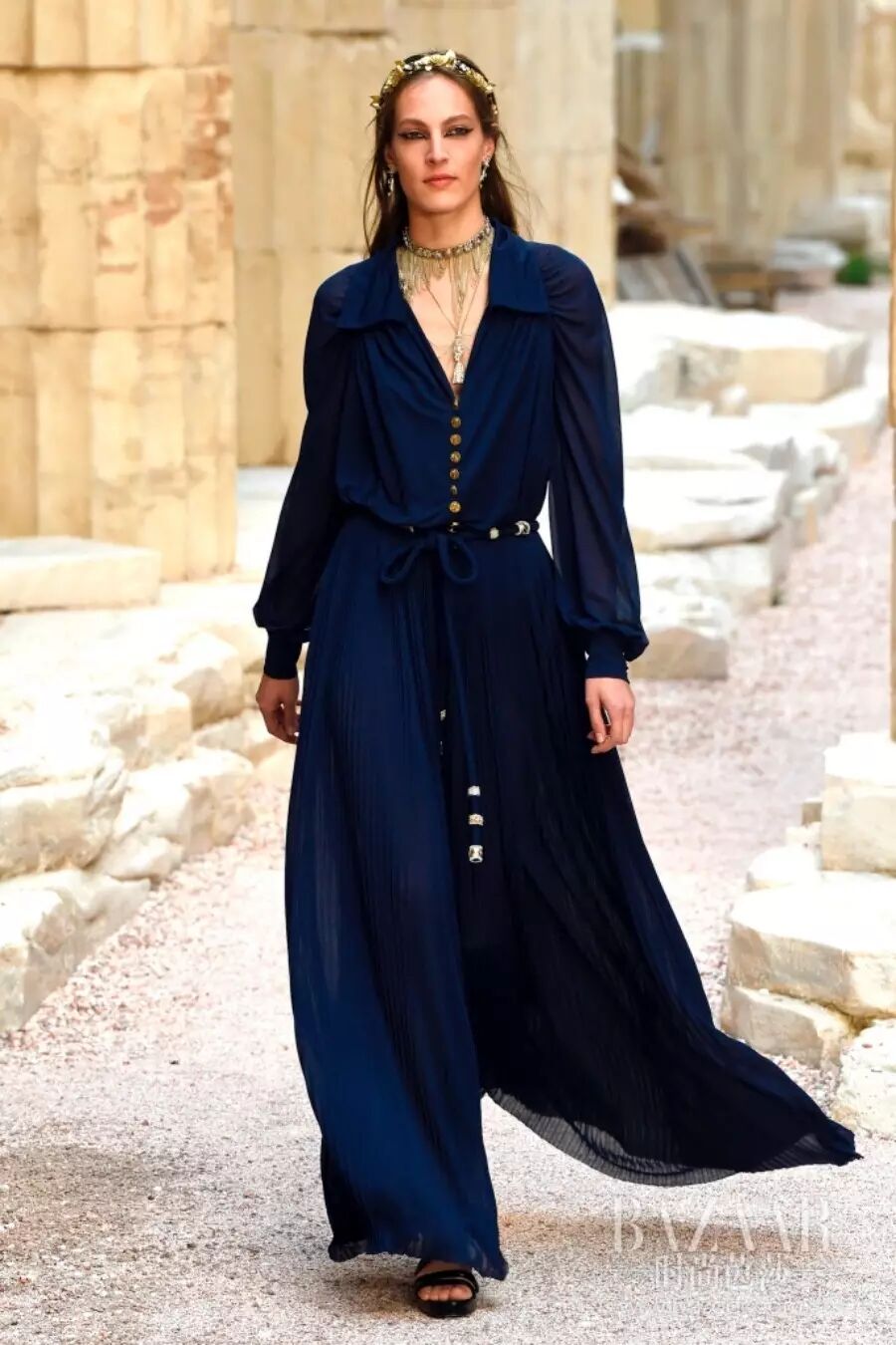 Chanel 营造了古希腊残垣庙宇的场景,华丽庄严的多立克柱石林立在秀场中央,模特们行走其中,描绘出典雅美丽的女性形象。