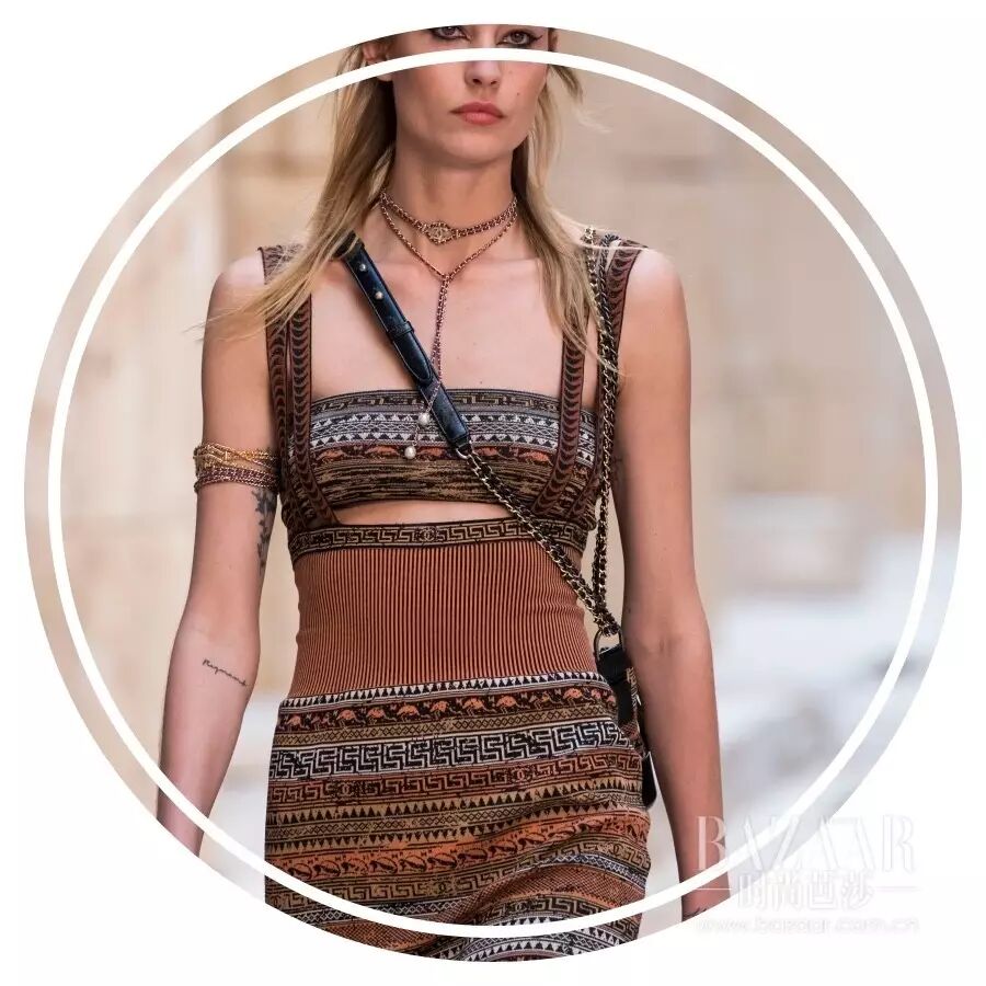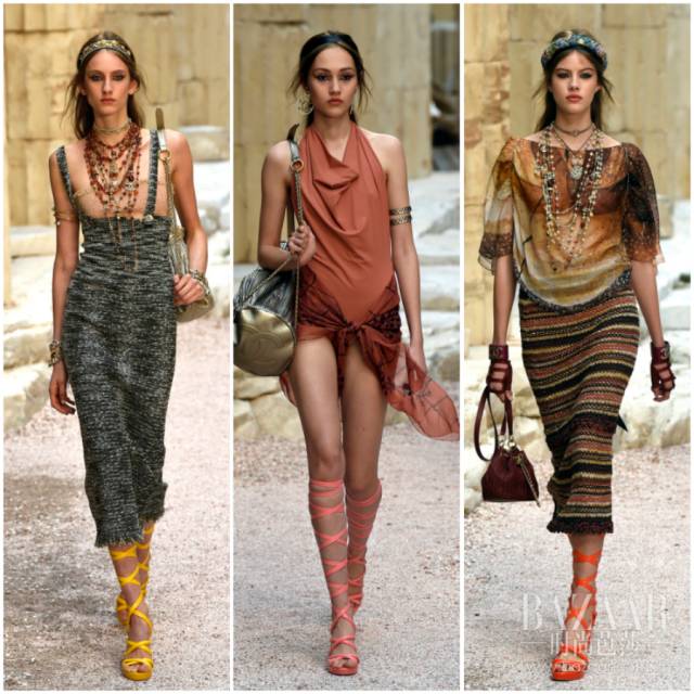 流苏须边与刺绣互映互衬,独特的圆柱式高跟设计令希腊传统角斗士凉鞋更显优雅,奥林匹克花冠化为精美的头饰,颈饰、手链以及金色宽手镯,古代勇士背上的箭筒化身为时髦的金色褶皱双肩背包。