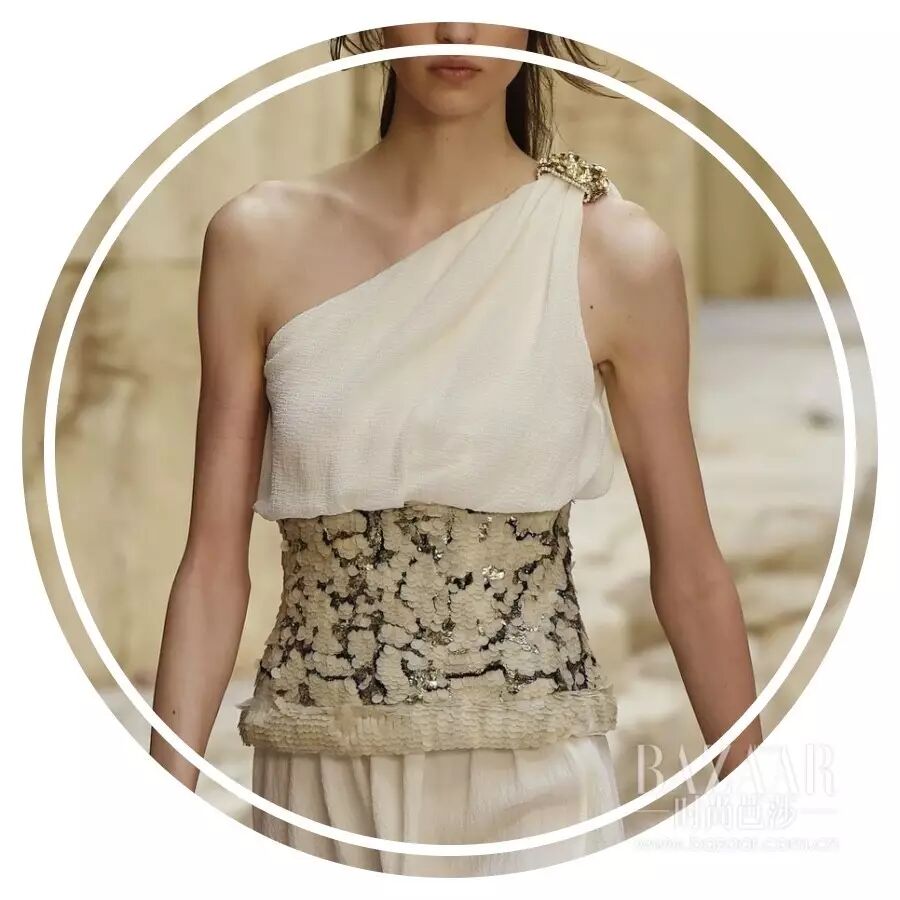 Karl 运用垂褶手法的希腊式衣袖,也是采用收褶设计的肩部线条,作为对位体现,还有强调腰线或束以腰带的轮廓。