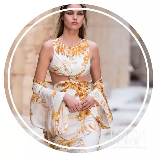 希腊神话里的林中仙女们也在T台上翩然出现,她们穿着Jersey针织或丝透纱连衣裙,外搭印有金叶桂冠的长罩衫。绣有蜗旋图案、生命与能量图案的连衣裙,为斯巴达风格上衣和半身裙注入平衡美感。