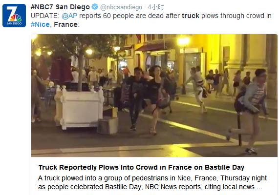 在刚刚过去的几个小时前,你可能知道法国南部尼斯发生了严重的恐怖袭击事件!现在,我们有一些最新进展可能是你还不知道的! 尼斯(Nice)就是这个地方! 首先,死亡人数和伤者人数已经比一个小时前大幅增加!现在,已经证实的死亡者超过80人,重伤者18人,其余伤者已经接近120人!在伤者中已经被证实有2名中国公民。 首先请大家一定记住下面这张图! 就在刚刚几十分钟前,法国总统奥朗德刚刚发表了讲话,证实这是一起早有预谋的恐怖袭击!并对此进行强烈谴责,称这是懦弱凶残的行为。他呼吁全体法国人在国家连续遭受袭击事件后保持冷静~~ 法国内政部已定性为恐怖袭击事件! 实施这起恐怖袭击的嫌疑犯照片疑似在社交网络上被曝光:31岁的尼斯本地人,突尼斯裔! 法国媒体称,当地时间2016年7月14日深夜,一辆卡车上装载着武器和手榴弹冲进了狂欢的人群,造成重大伤亡! 恐怖分子向正在观看烟花表演的人群用机枪扫射。在恐袭的卡车里,警方发现枪支和手雷,说明这是一起有预谋的案件! 消息称,当时司机曾持枪扫射人群。。。 这是当时恐怖事件发生时现场的情景,你感受一下。。。 快跑!。。。 恐怖分子向人群扫射,发生爆炸后,所有人四处逃窜 卡车冲入人群的一瞬间! 点击看现场视频 事发后,法国总统奥朗德正返回巴黎准备参加一个内政部就此事件举行的紧急会议。 简直就是大屠杀!满地都是尸体。。。 阿尔卑斯滨海省的代理警察局长Sébastien Humbert说,事发靠近海岸沙滩的盎格鲁大道,卡车冲撞人群行驶了一大段距离, "这是为什么死亡人数异常高的原因"。 尼斯当地居民Wassim Bouhlel目击了卡车碾压冲撞人群事件的发生,他说,他看到一名男子拿着枪,并开始射击,"路上出现了大屠杀,"他说,"到处都是尸体。" 华人导游陈先生当时正在尼斯带团,他说,当时正在案发的尼斯英国人散步大道看焰火,晚上10点25分焰火就结束了。他和大家一样溜达回酒店,10点30分左右忽然人群发生骚动,很多人在奔跑,是逃命式地跑,接着一声巨响,像放炮仗的声音。 陈先生说,"我还以为海啸了呢,看见很多人没命地跑。" 记者戴米恩·阿莱曼德(Damien Allemand)称他看到受害者"向保龄球瓶一样到处飞",那种"刺耳的响声和哭叫声"他永远不会忘记。 袭击事件发生时,来自伦敦的Harjit Sarang和丈夫及两个儿子都在现场。 她在推特上发文称:"控制不住,身体一直在颤抖。为什么我的孩子要经历这些,为什么要带他们来这儿,为什么(这些人)要这么做。以后再也不带孩子们参加这种公共活动了!" 在尼斯经营一家象棋俱乐部的Yves Lamorelle说,袭击发生时他正在附近的一家咖啡店里。 "我正在喝咖啡,几分钟的时间人们开始疯狂奔跑起来,到处都是尖叫声。桌子椅子被撞得乱七八糟,玻璃杯砸碎在地上,人们茫然慌乱的互相推挤" 警方调查,卡车司机是一名31岁的尼斯本地人,突尼斯裔! 突尼斯:阿拉伯国家,位于北非,信仰伊斯兰教,穆斯林占全国人口的95%以上。 据称,在他被警方击毙前,曾大喊"Allahu Akbar"(God is greatest)。 幕后操纵者是谁? 据未经证实的法国媒体报道称,"伊斯兰国"组织已经宣称为此次尼斯袭击事件负责。 而在此前,法国当局宣布加强国庆安全措施前两周,首都巴黎附近一名法国警察局长及其伴侣遭到一名男子刺杀。"伊斯兰国"(IS)宣称对此负责。 Pray for NICE 为尼斯祈祷,愿世界和平! 愿悲剧永不再重演! |