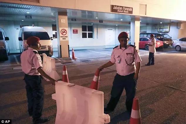 为金正男做尸检的马来西亚一医院前,警察守住入口。