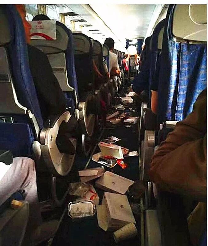 周诗鲤放在餐盒上的手还未收回,飞机顶部传来“轰”的一声巨响。 ▷飞机剧烈颠簸后,过道上落满了餐盒