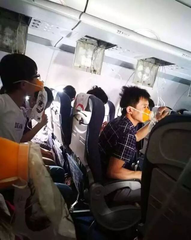 而据机长刘传健事后对媒体的描述,事发时没有任何征兆,驾驶舱右座前风挡玻璃就突然爆裂,发出“轰”的一声巨响,裂痕呈一道道的网状。 ▷很多乘客第一次见到氧气面罩