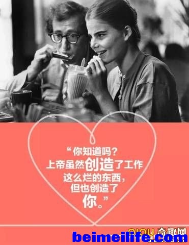 1 s% {( ~* l. Y& F; O# M/ @% S, ^+ [ “你知道吗?上帝虽然创造了工作这么烂的东西,但也创造了你。”——Woody Allen