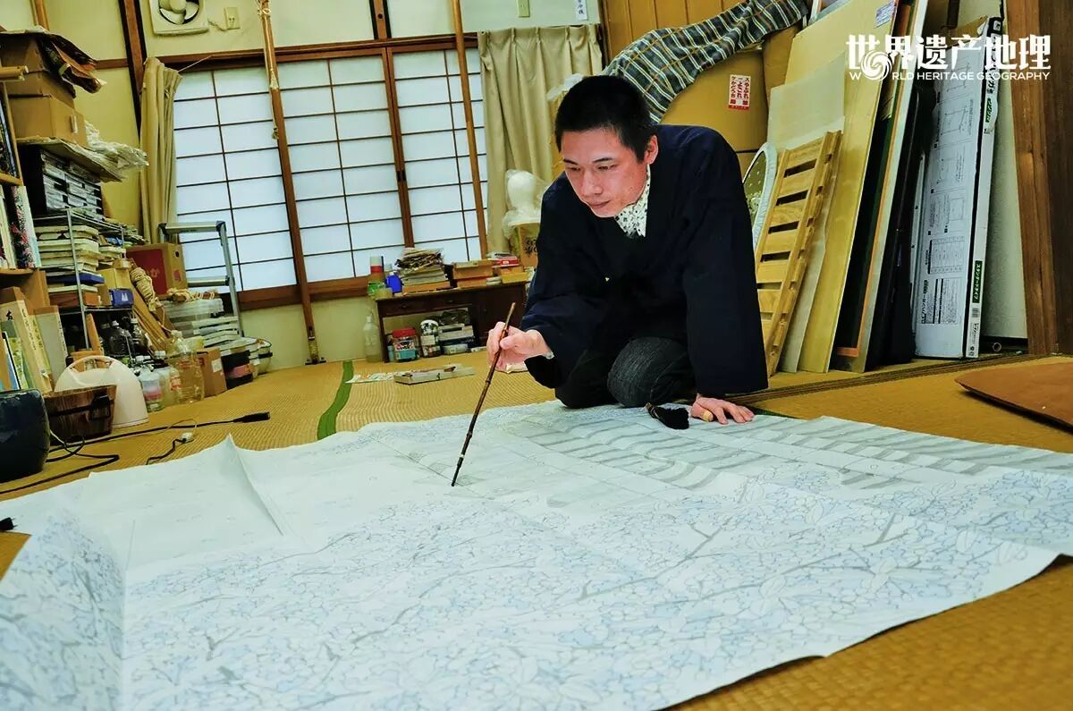 看他手上的小样,果然是描绘在和服剪裁纸样上的,依稀可以想象出袖子、裙裾的位置,这些地方都绘有繁复而精美的花纹。小样构思好之后,会被放大绘制在实际尺寸的纸上,是为大样,例如我们眼前这幅巨大的樱花图。上仲正茂说,绘制大样并非原原本本地照搬小样,通常一边画一边修改,因为很可能之前的想法并不适合实际尺寸。这个过程充满了变数和挑战。从另一个层面而言,这正是友禅染和服的独特之处,它浸染着创作者的灵感与用意,是一件有思想的和服。