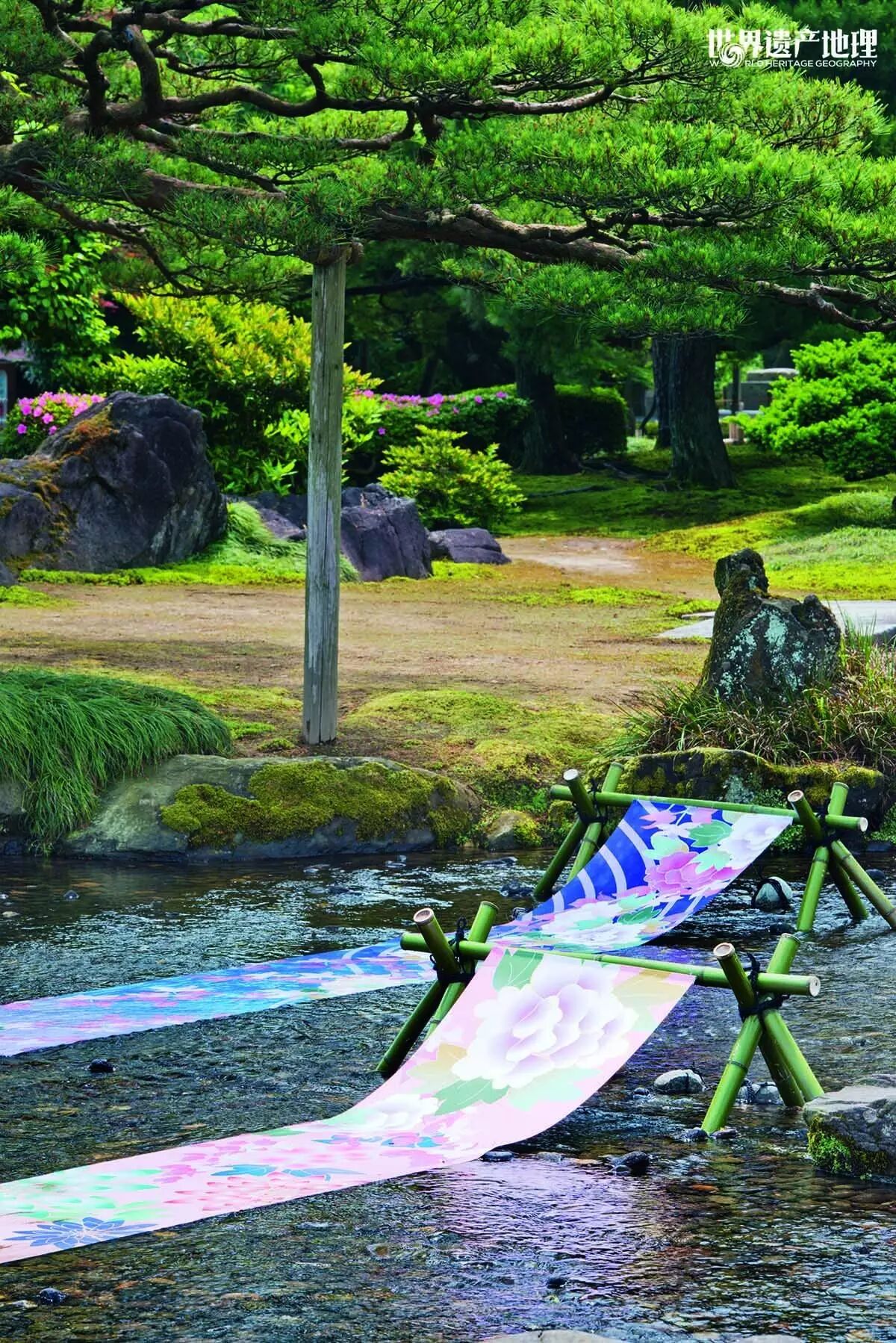 友禅染,是日本独有的一种染色方式。试想,粉色樱花瓣之下,鸭川水抖落开窈窕的五彩布条,顺便也被渲染上了缤纷斑斓的色彩——那该是多美的一幕。而我此行的目的,正是这美好而浪漫的友禅染。