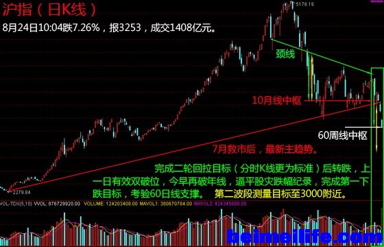 周一中午收盘,沪指跌8.45%,报3211,成交2433亿元,今早盘沪指顺势而下,进阶破位,目前年线与60周线双双处于失守状态追平6月股灾下跌记录;两市仅13股翻红。7 w* ~' j) V/ E% O: k9 N R