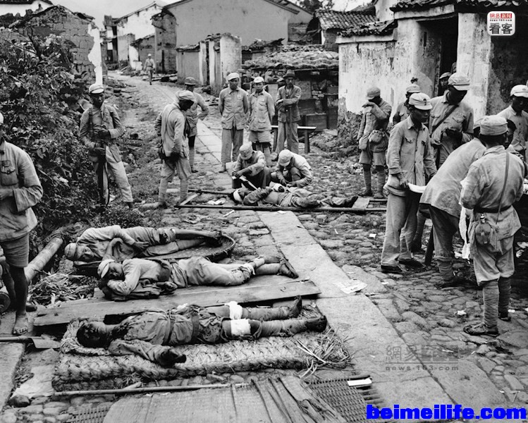 : A8 p. N$ B# B1944年3月31日,在缅甸北部的胡康河谷,1名美军士兵给1名中国伤兵点烟。在胡康河谷,中国驻印军几经血战重创了日军第18师团。6 N/ `" u' {# Y- f: P: I