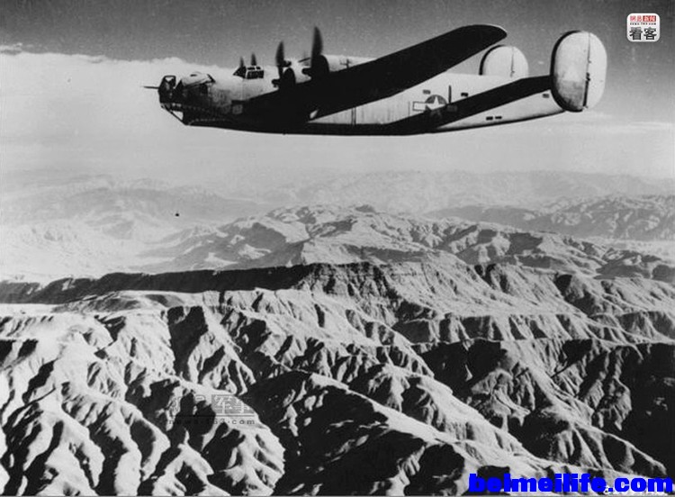 ( o' m3 k% S9 |6 \; K1 d“驼峰航线”是二战时期中国和盟军一条主要的空中通道,始于1942年,终于二战结束,为打击日本法西斯作出了重要贡献。“驼峰航线”西起印度阿萨姆邦,向东横跨喜马拉雅山脉,高黎贡山,进入中国,航线全长500英里,地势海拔均在4500-5500米上下,最高海拔达7000米,山峰起伏连绵,犹如骆驼的峰背,故而得名“驼峰航线”。在这条世界上最危险的航线上有近六百架飞机坠毁,超过一千人牺牲,在中国抗日航空烈士纪念碑上有二千二百个美国人的名字,这些年轻的美国飞行员,把他们年轻的生命献给了中国的天空。他们什么都没有留下,唯一留在这个世界上的只有纪念碑上这些名字。 图为1945年10月2日,一架B-24轰炸机沿着著名的“驼峰航线”飞跃喜马拉雅山山脉。虽然这张照片摄于战后,但是却非常直观的体现出了驼峰航线的艰险。+ }, K5 r: a+ a