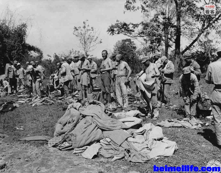 1945年1月23日,在缅甸南坎以东20英里的木司,中国驻印军新1军的士兵与1名中国远征军士兵相遇。中国远征军的被服是国内供应,而中国驻印军的被服是美国供应的。两者从外表来看相差极大,当时中国300个师,也只有驻印军区区几个师能有如此待遇。 \6 M% G8 P" o$ P8 T& ^' g
