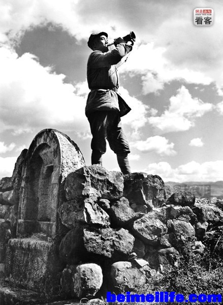 0 }! v* _3 D$ _. ?8 B1 N0 X在中国云南,大批中国军队中的精锐部队集结到这里,准备接受美国援助和军事训练,他们将从云南出发与从印度出发的中国驻印军一起夹击缅北滇西的日军。图为1名中国远征军号兵在一座古墓顶上吹响起床号,呼唤战友们起床,为了早日战胜日军而开始新一天的训练。美军通信兵(U.S.Army Signal Corps)拍摄。" t. L$ s" ]" R