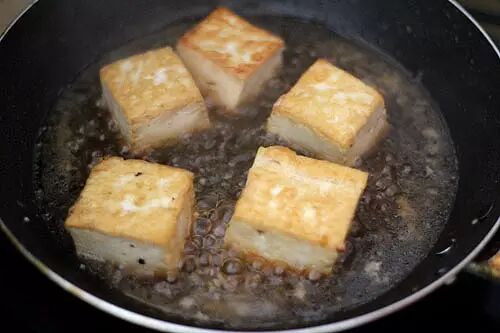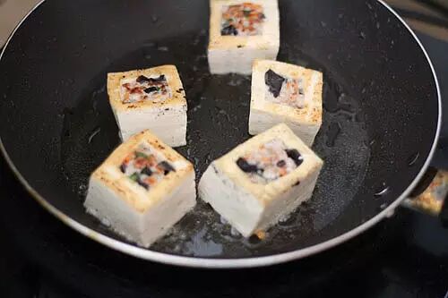 . v/ \% Q1 ~4 }/ [) Q3.热锅入油,放入酿好的豆腐煎熟。