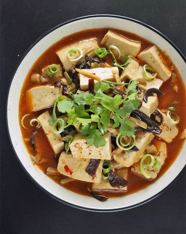 & f! J5 Q8 K( `& g) f0 d材料:木耳、豆腐、平菇、葱、姜、蒜、香菜、油、豆瓣酱、盐、糖 # A/ `& W% C, G/ I/ H