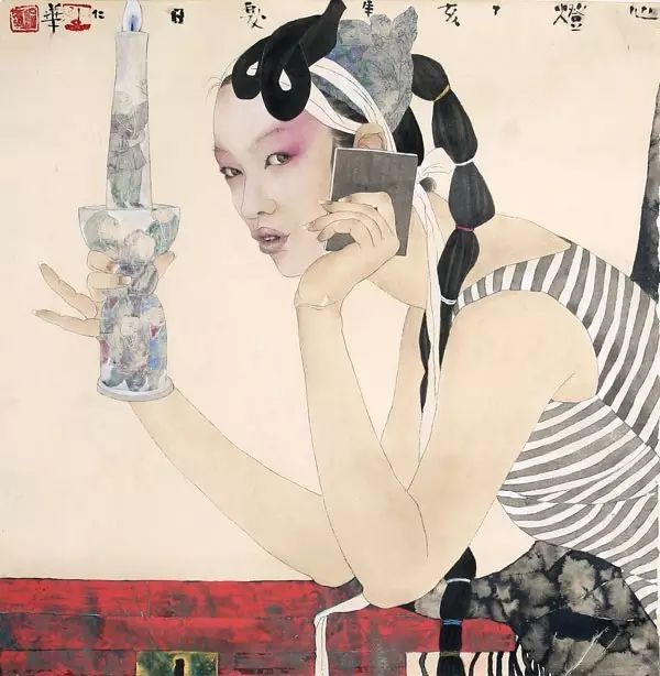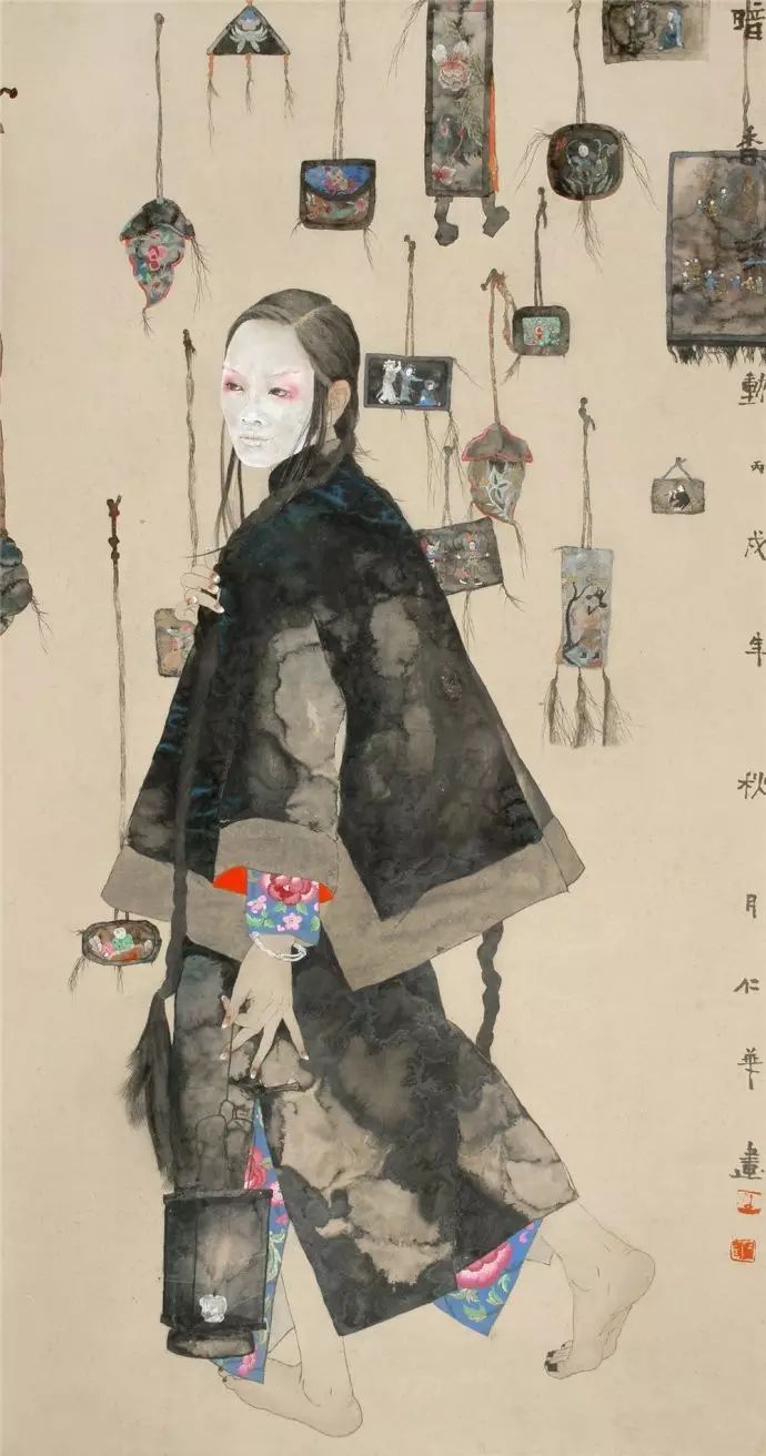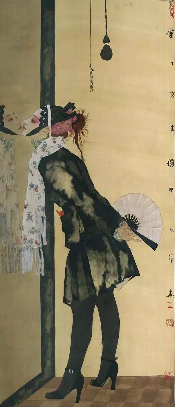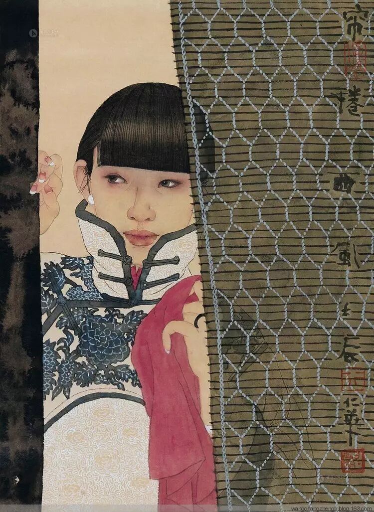 $ k& N0 [$ o, v! o画中一位古典女子,掀开席帘向外窥探,巧妙将新旧古今、个人与世界隐喻于里面。
