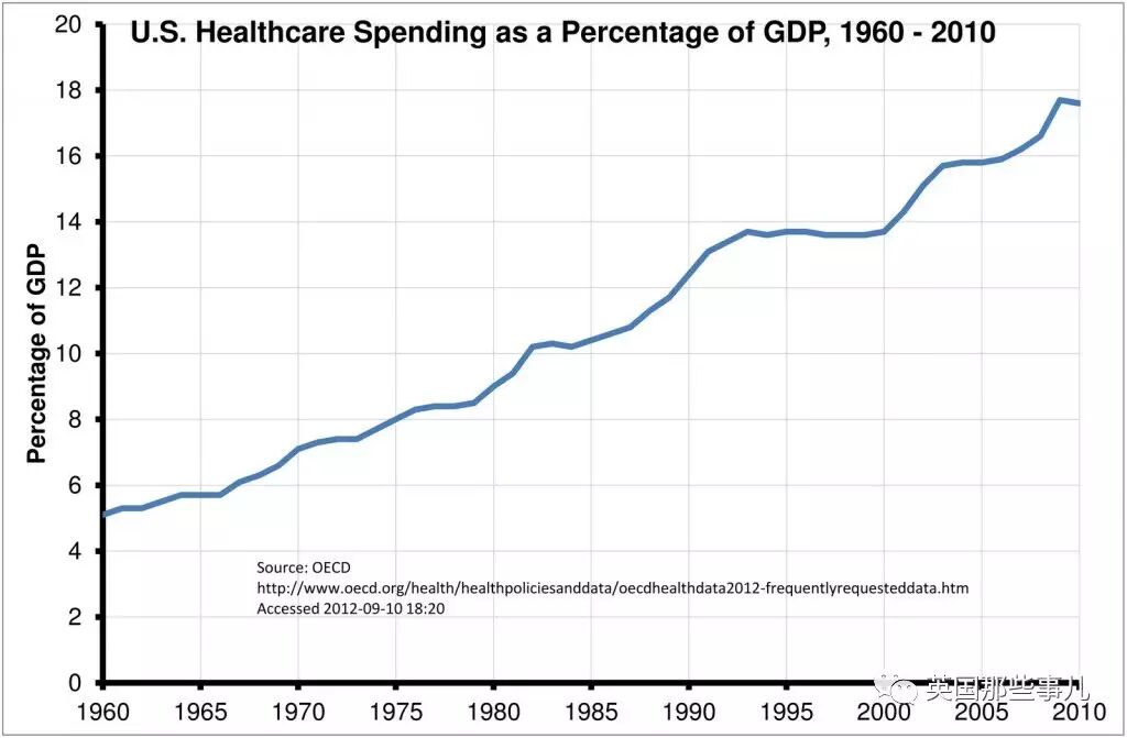 [花钱多] 从1960年到2010年,美国的医疗开支一直呈显著上升的趋势… 2010年,美国的医疗开支占到GDP的将近18%, 全国医疗卫生开支逐年递增,2010年,人均已达8402美元。 在美国看病住院,每天的花费也远超其他国家。 (住一天院平均1.2万美元,接近8万人民币..原因前面已经说过了) 庞大的个人医疗支出引致了巨额的医疗贷款,因为付不起医疗费而导致的个人破产就占了全美国破产个案的62%。