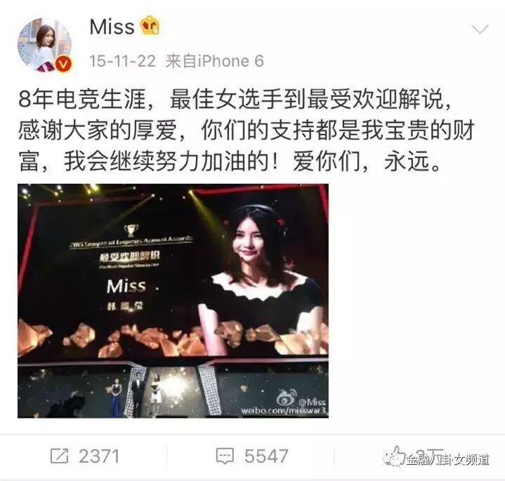 钱景好前景也好 2015年她就获得了 英雄联盟最受欢迎解说