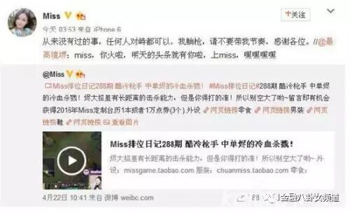 刚开始男生还会嘲笑Miss不会打游戏 没过多久跟她一起去网吧的男生 已经没人能够打赢她了 哦对了Miss这个ID就是那时候起的 她说没有特别的含义 就是网吧打游戏时候胡乱起的 没想到这个ID如今这么大红大紫