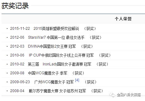 正是这样一场胜利 Miss被游戏星探发现 2007年她加入中国第一家女子魔兽战队First 第二年加入一家台湾俱乐部 2012年又加入到韩国StarTale俱乐部 当年6月还成为第一个在韩国成了MVP的中国选手 这段经历很厉害, 不过大家可能也对他们不熟悉 我就简写了 但MIss的这些获奖都是货真价实的 很多都是世界级的冠军