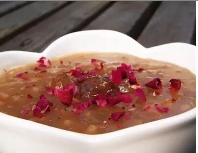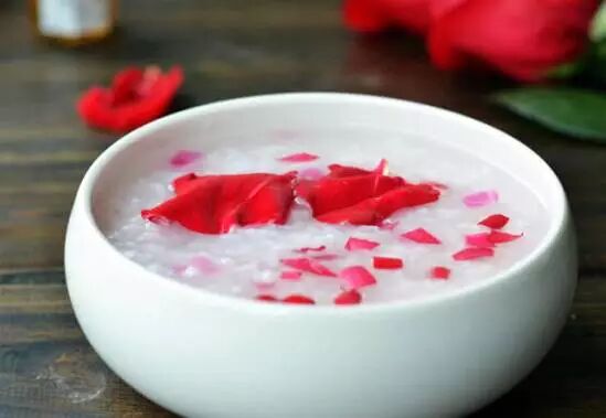 做法: 1.玫瑰花瓣洗净,取几瓣细细切碎,剩余的用水浸泡,大米洗净用水浸泡2小时。 2.锅置火上,放入清水与大米,大火煮开转小火熬煮30分钟。 3.将玫瑰花瓣碎末,冰糖放入粥中,继续慢火熬煮20分钟,撒上其余花瓣,花瓣中浇入蜂蜜即可。 功效: 玫瑰有凉血,养颜,改善皮肤干枯的作用,由于浓烈的花香,所以治疗口臭的效果也很好,还能助消化,消脂肪。整瓣花瓣一定要趁热撒在粥上,热气蒸腾下才能让玫瑰香气四溢。